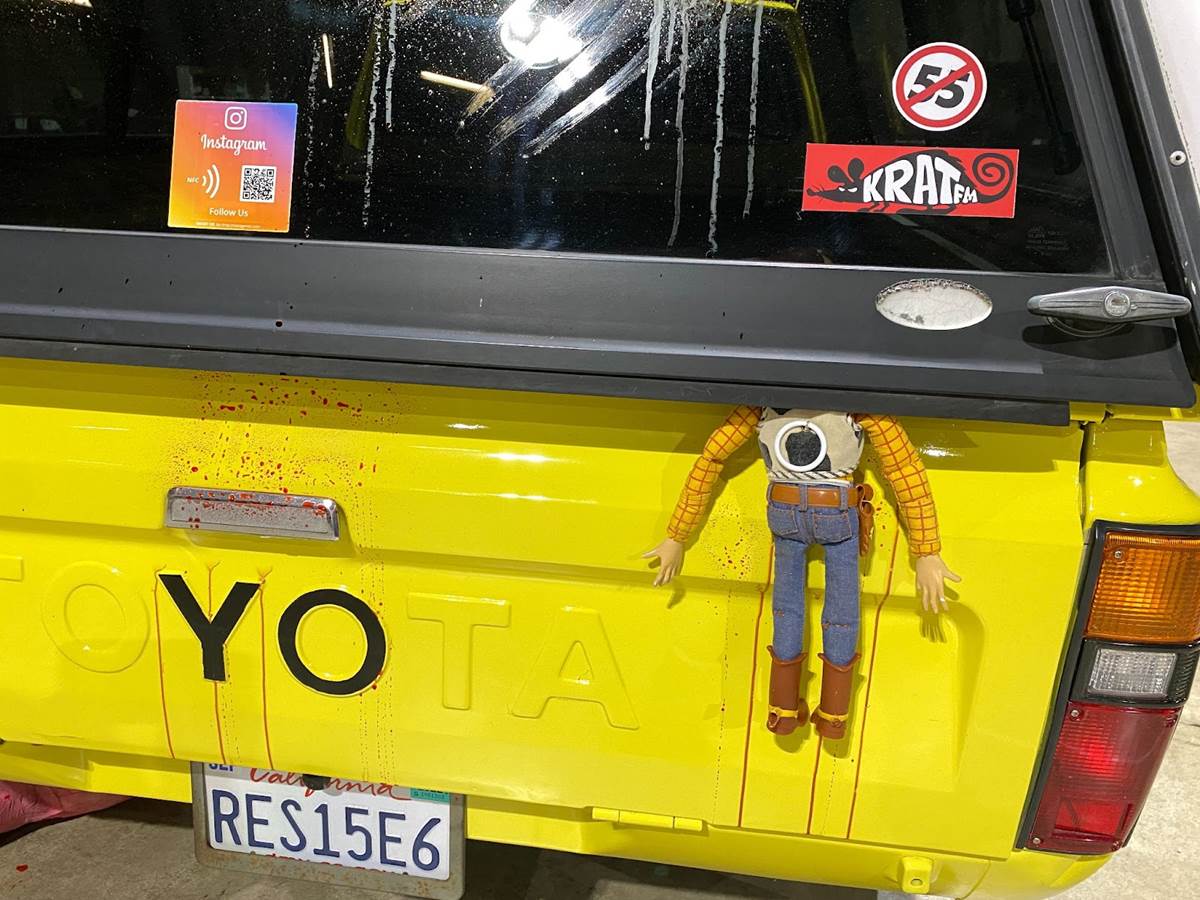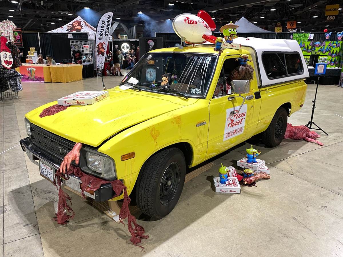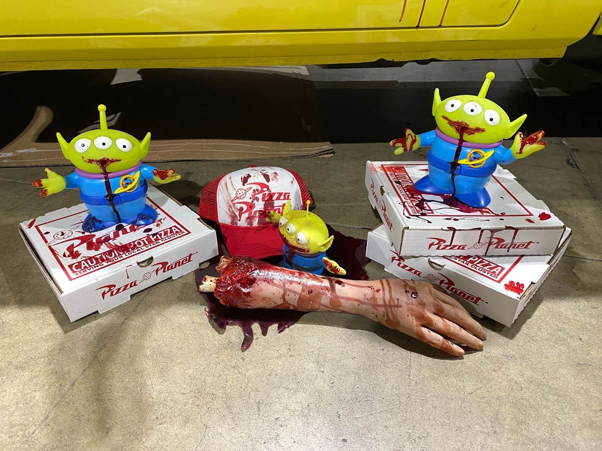 Pixar fans couldn’t resist snapping photos of this gruesome take on the Pizza Planet truck, complete with human-eating aliens and a poor Woody doll trapped in the hatchback.