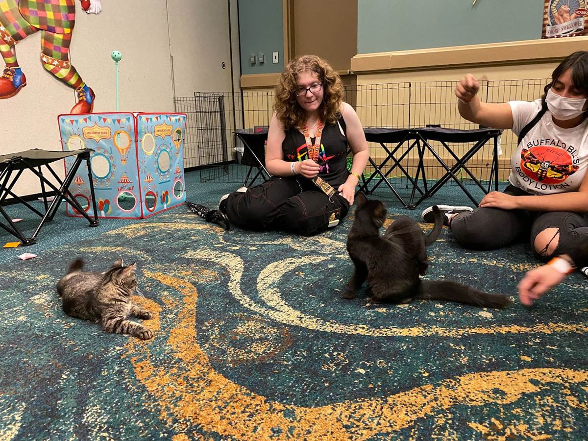 But one of the most popular spots at Midsummer Scream is of a much cuter nature: in the Black Cat Lounge, guests can meet furry friends who are all up for adoption.