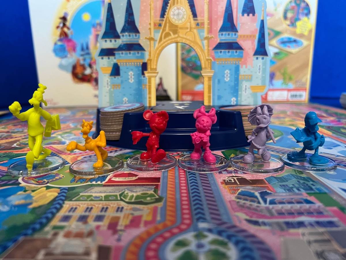 Gameplay occurs over the course of a single day in Magic Kingdom Park. Players start by deciding which character they will be: Mickey Mouse, Minnie Mouse, Donald Duck, Daisy Duck, Goofy, or Pluto. Each pawn is posed in a way that not only expresses their personality but also how they would play in the park. Donald Duck, for example, seems to be frustrated with his park map.