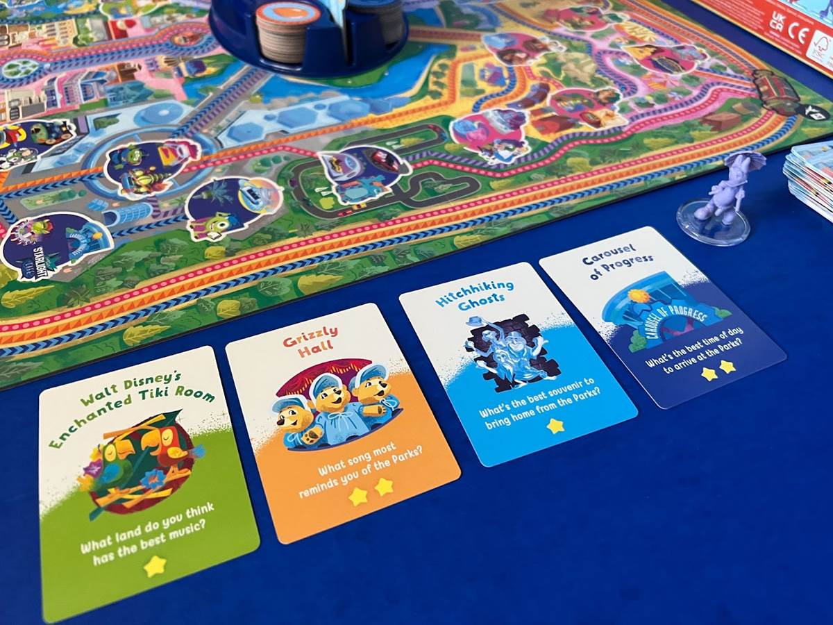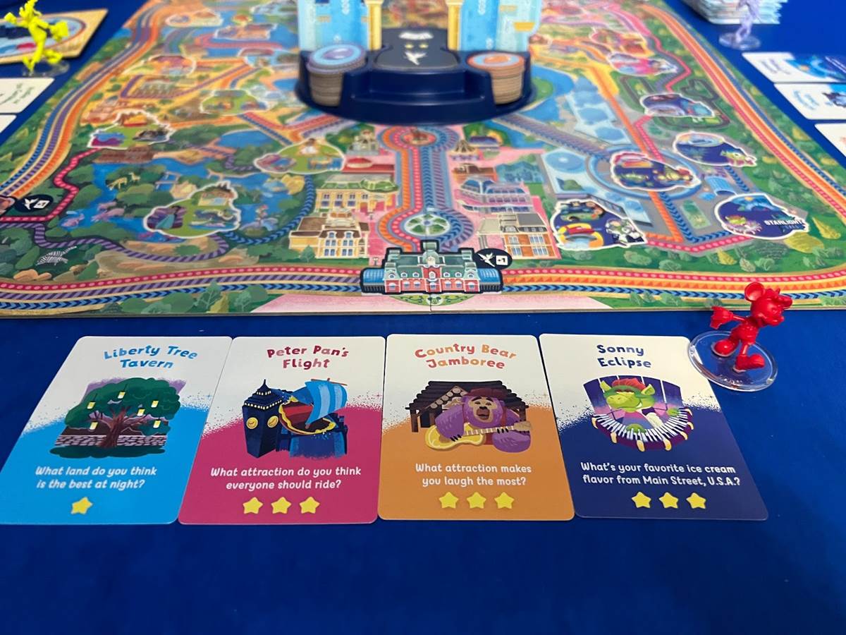 In real life, you don’t need balloons to get from one location to another at Walt Disney World, but one thing Disney Happiest Day Game: Magic Kingdom Park Edition is spot-on with is the layout of the park. Players can use the Walt Disney World Railroad to move around the board a little faster, with the three train stations accurately placed in each land. A family getting ready for their first trip will be better able to get around the park after playing because they will know some of the basics, like which side of the castle they go if they’re looking for Frontierland, or where they might head if they wanted to get a picture with a Disney Princess. The questions on the cards might also help players determine how to plan their day better, as they might reveal what each player might enjoy most when they visit.