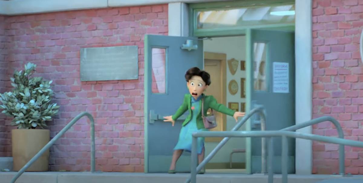 Also helping give a 2D look to a 3D film - window glare. 2D style graphic window streaks were applied to nearly every piece of glass in the film. They can be seen in windows throughout the film, in picture frames, and even in the microwave of the kitchen scene. New formulas had to be written into the shaders used on the movie so that they can be easily applied and not have to laboriously be done one by one. In the picture below, look at the windows in the background. They have a flat styling with the diagonal window streaks common in comic strips and hand-drawn animation, but remember, all this was built in a 3D virtual realm.