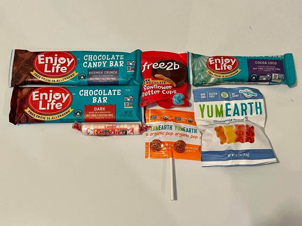 When you get there, you hand in your tokens and the cast member will ask you what your allergy is. There is a list of treats available inside there and what each one is free of. Once I said I could not have dairy, they showed me the options available to me and asked if I wanted to select certain ones or just have a variety. Here are the candies that were available to me. They gave me multiples of each.