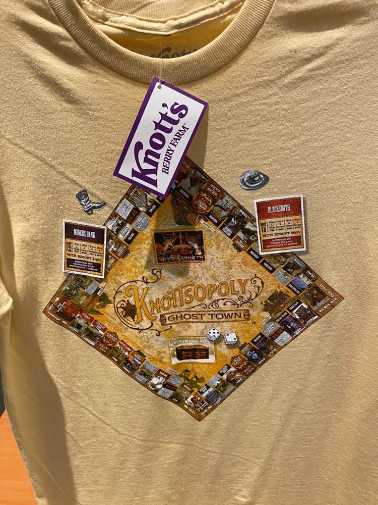 At the end of 2021, Knott’s released their own version of Monopoly, called Knottsopoly. Now you can get the board design as a shirt and a pin.