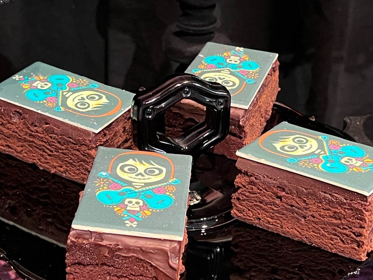 Next, we’ll head back to the hub to vist the carts near Cinderella Castle and get “Un Poco Loco." Miguel adorns the “Mexican Spiced Hot Coco Brownie," which is a spiced brownie with dark chocolate ganache topped with a themed chocolate piece.