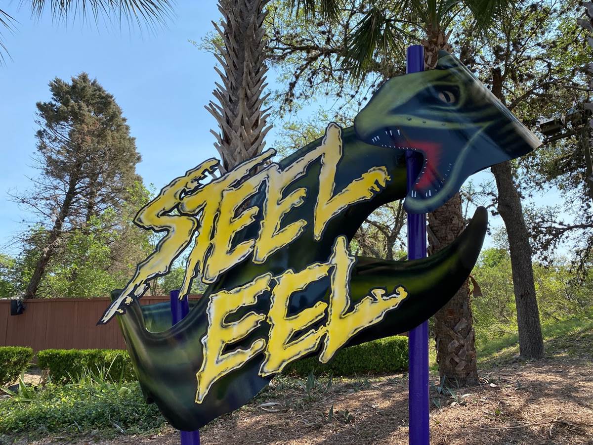 Steel Eel looks like a hyper coaster (200 ft+), but it’s actually a mini-hyper, standing at a height of 150 ft. But don’t let that somewhat smaller size fool you, this ride is incredible. First off, I adore the color scheme: bright yellow track with purple supports. The way that this coaster towers over the back of the park’s skyline is stunning. Aside from the aesthetics, the coaster experience is great, with every hill providing really fun and strong moments of airtime. Add to that a great feeling of speed and beautiful views of the San Antonio area, and you have yourself a winner!