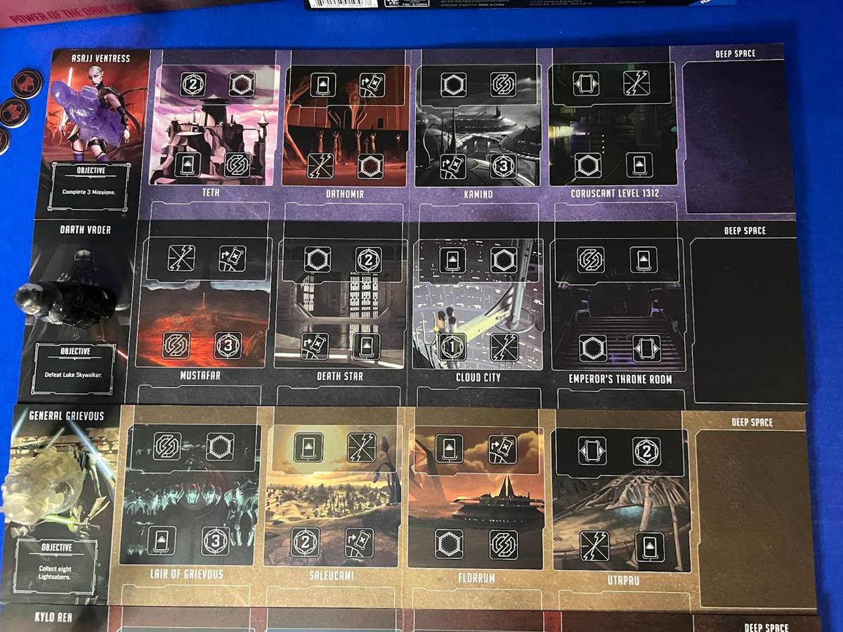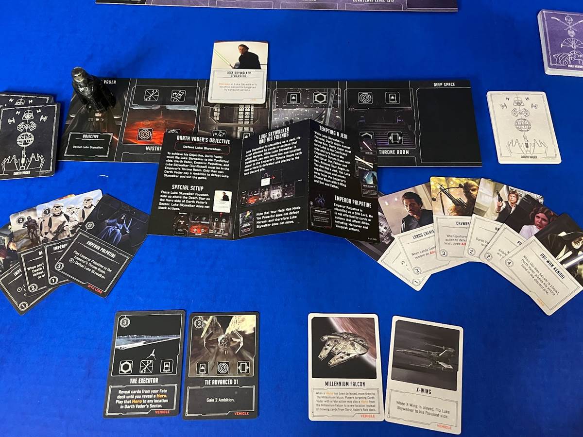 Setting up the game is quick and easy. Each character has a Strategy Guide and there are also enough Reference Cards for each player that offer a key for the action symbols on your sectors in addition to a brief description of each villain’s objective. Some characters include extras. Darth Vader, for example, must flip a Luke Skywalker card from being focused to being conflicted in order to defeat him, which is a bonus sturdy card separate from the fate deck.