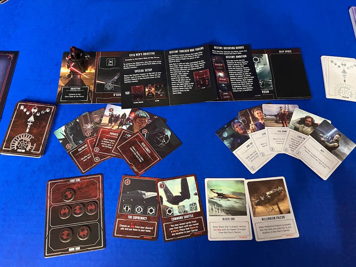 Kylo Ren is having an internal battle with the light and dark sides of the force, so he includes a “Destiny Tracker" and 6 “Destiny Tokens." To complete his objective, he will have to earn and spend Ambition (tokens earned during game play that can later be traded for actions) to play his Sith mentors while trying to avoid Jedi heroes that want to pull him back to the light side.