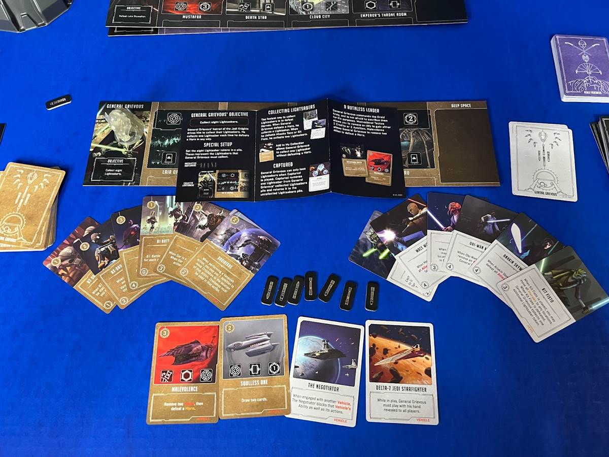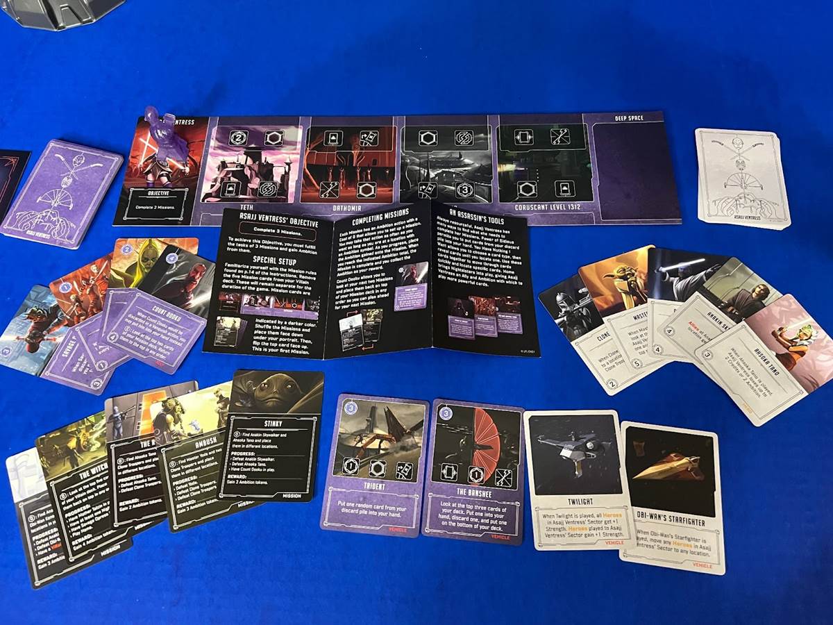 Asajj Ventress comes with a set of 5 mission cards, 3 of which must be completed to achieve her objective. These mission cards almost serve as a bonus third deck for her.