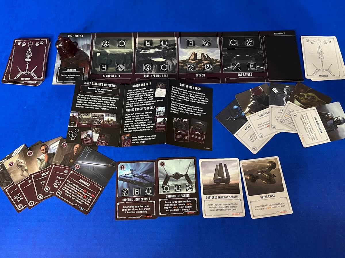 Those familiar with Disney Villainous will find Moff Gideon to be the most similar to the original game. You have to line things up to complete his objective, capturing Grogu and getting Doctor Pershing and Laboratory Samples into play. But there are no additional items beyond the two decks of cards to play with.