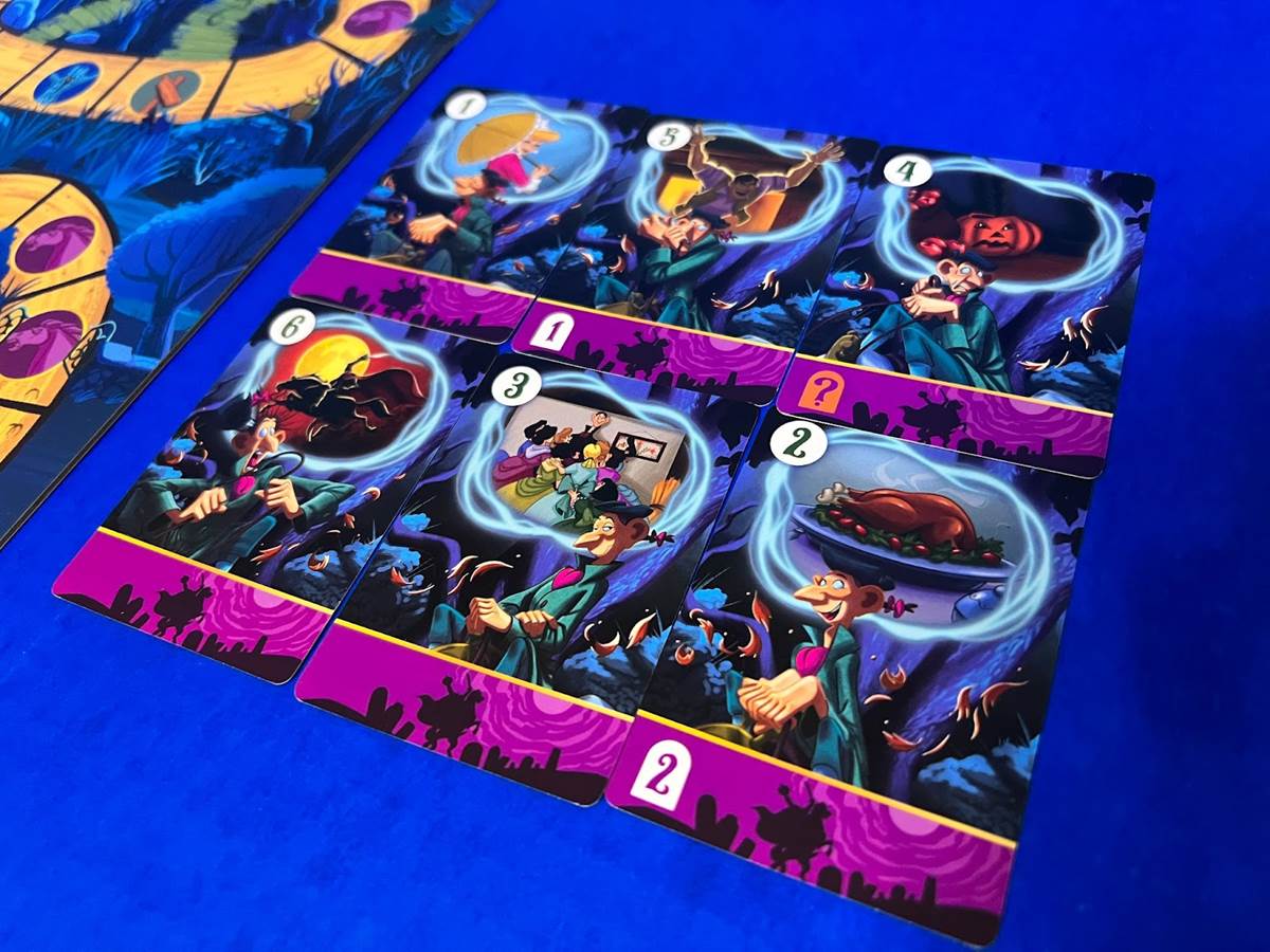 Players draw cards from the deck and play them at the same time. The upper left contains a number of spaces Ichabod could potentially move, while the bottom contains potential moves for the Headless Horseman. It’s in players’ incentive to make a match quickly, because the lowest number matched is the total amount Ichabod can move. However, the headless Horseman gets to move the sum of all of the tombstone numbers.