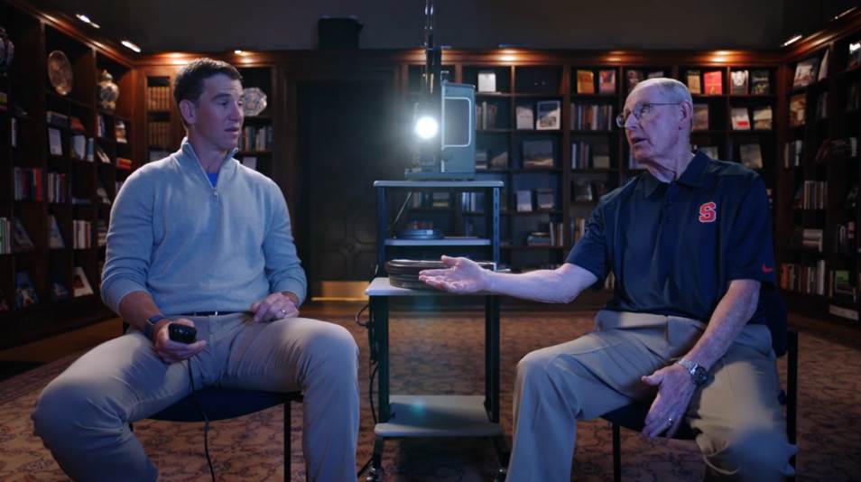 Next, Eli heads to Syracuse to meet with his former coach, Tom Coughlin, to talk about the number 44. The number was worn by a trio of great running backs: Jim Brown, Ernie Davis and Floyd Little. The old coach-player combo sit down to watch some old footage of all three players. It’s always fun to watch highlights of legendary players and these are some of the best. Eli then gets a chance to torture his old coach by rolling some of his film from his time playing at Syracuse.