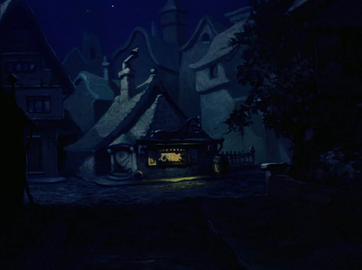 Immediately, we see Jiminy (voiced in this version by Joseph Gordon-Levitt) outside Geppetto’s workshop and home on approach. In the original film, we are treated to more of a POV shot as the iconic cricket bounces along looking for warmth in the evening.