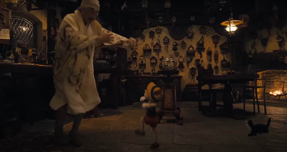 While the screengrab from the new film seems to take place when Geppetto is wondering where Pinocchio is at such a late hour, we are also treated to the visual feast of handmade cuckoo clocks and gizmos that adorn the walls of his home and workshop, which somehow immediately makes me want to ride Pinocchio’s Daring Journey at Disneyland Park.