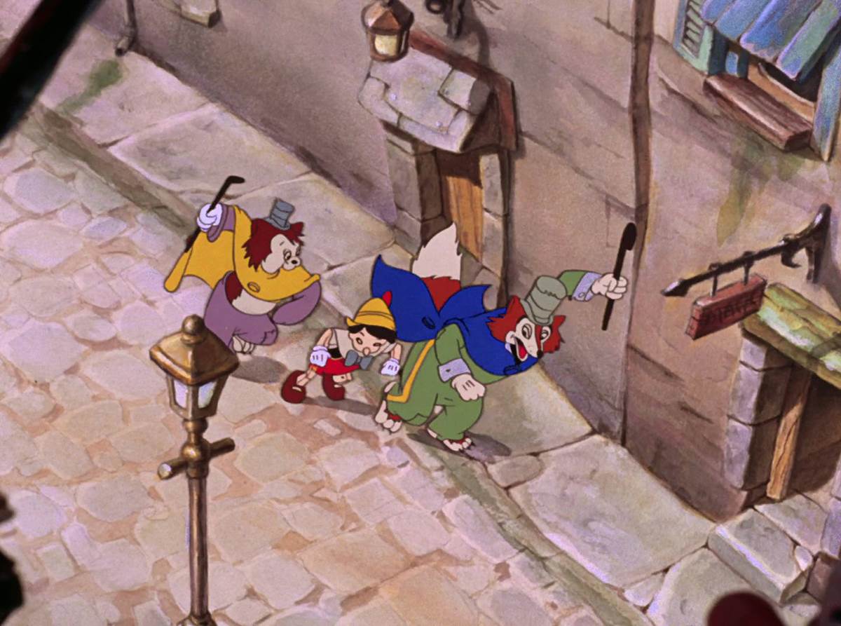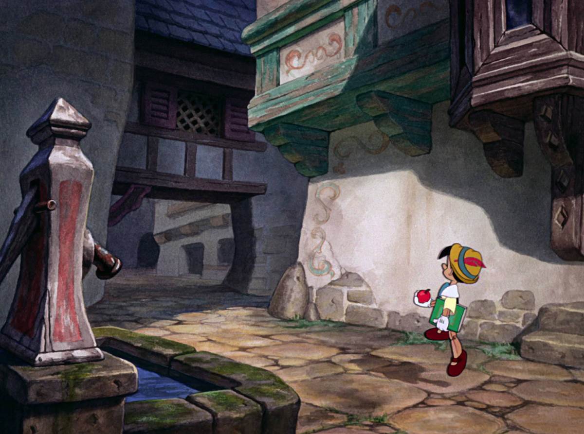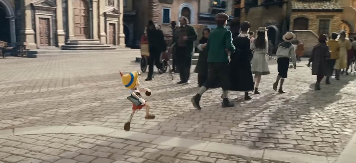 Fun fact about animation, the more characters you put into a shot, the more difficult and expensive it can be. Here against the live action shot we see Pinocchio going to school with a bunch of villagers that animators in 1940 probably would have liked to included, and the new adaptation finally did.