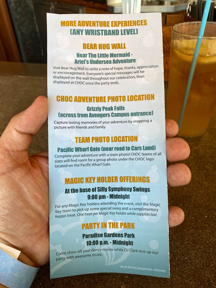 The CHOC Adventure in the Park event began with a mix-in with regular DCA guests at 5:00 PM on Saturday, August 27th, followed by the CHOC Walk participants having the run of the park starting at 9:00 PM and running through midnight.