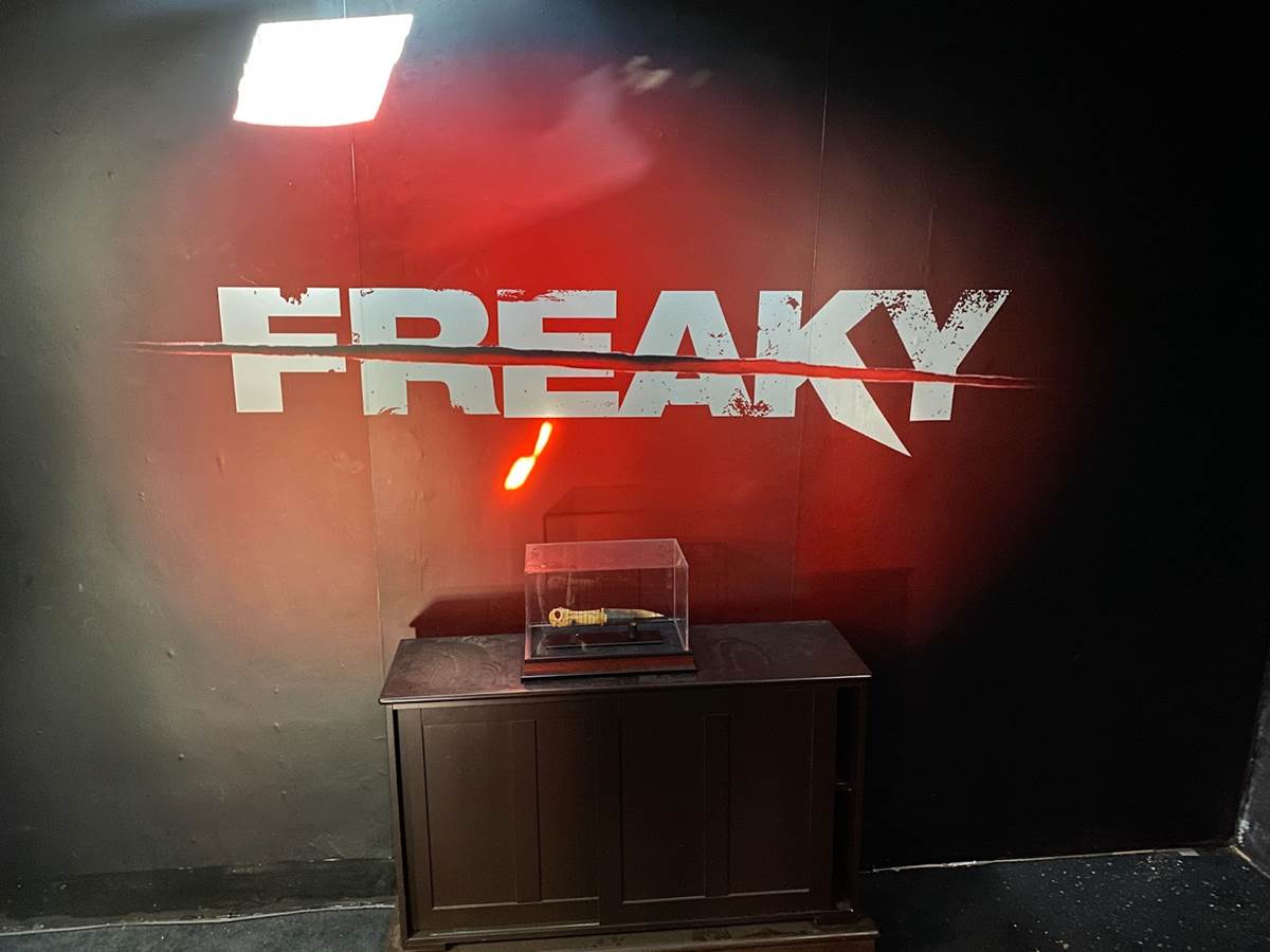 “When I saw Freaky, I just loved it. I thought Freaky was great. What a fun horror movie combining the idea of Freaky Friday with a horror movie. I just thought it was a heck of a lot of fun, and then when I got to screen Black Phone before it came out, I thought that also had a lot of content to mine. So we decided just to focus on two movies. The idea with the video store is that it's pretty much a portal to hell. There’s gonna be red smoke and eerie light coming through [the entrance], and then once you step through the video store, you’re in the world of these two particular movies and we go from there. Like our previous houses, we always set it up with a title card for the movie we’re dealing with. We’re starting with Freaky, there’s a special effect associated with the La Dola Dagger– its eye starts to glow red with the narration. We’re picking snippets of dialogue from the film. Part of the challenge with Freaky is the story’s kind of complicated to explain in the context of a haunted house, so we had to come up with visual ways to tell this switching-bodies story with a curse and all that."