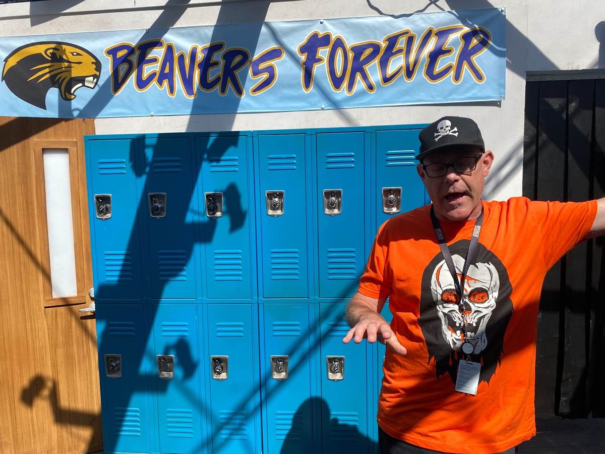 “We wanted to convey in this house the whole switching-bodies thing, starting with the night where the Butcher attacks Millie at the football stadium and he stabs her with the La Dola Dagger, but then he immediately reacts in pain as though he was stabbed himself. That’s what triggers the curse that causes the body change. The way we do that is when you leave this scene, it’s as if you’re walking along the outside of the football stadium with a concrete-block look. Then all of that disappears– it’s our disappearing room effect that we’ve used in ‘The Haunting of Hill House’ and ‘Freddy vs. Jason’ [houses]-- but in this case we want all those walls to disappear, and then there’s a set that the performers are in. It’s that Aztec temple and Millie’s in her mascot costume with that goofy beaver head."