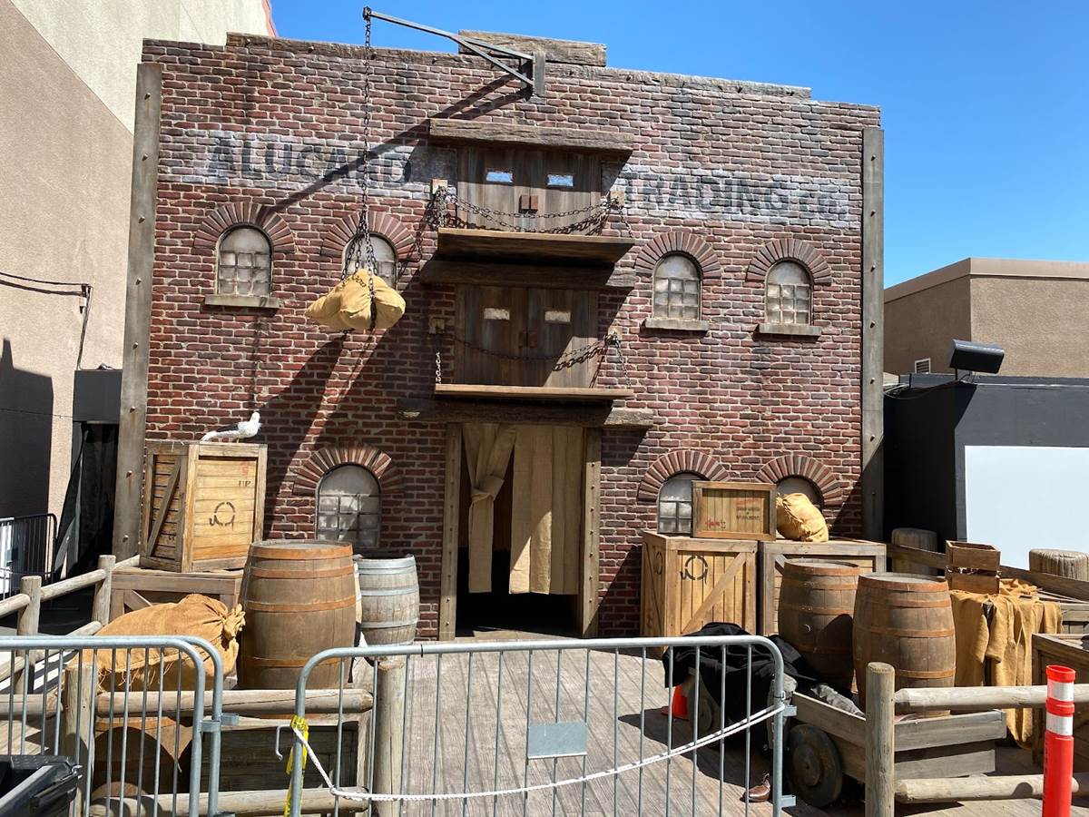 “If you notice, there’s a very large Easter Egg on the shipping warehouse. ‘Alucard’ is ‘Dracula’ spelled backwards. Dracula’s got money– he lives in that big castle in Transylvania, so he owns the shipping warehouse. He shipped his coffin back here, but through a series of circumstances, right when his coffin arrives, so does the Mummy’s sarcophagus, and so does the Wolfman, and it’s game on. To set up that story, we decided we actually needed a pre-show. So we created our own little video that’s gonna play while you’re waiting in line, and that's gonna set up this whole idea of curses and what brings these characters together– the Amulet of Amun-Ra. We sprinkled Easter Eggs throughout the whole thing– the symbol of Amun-Ra is stamped on these crates from Egypt, and then all the dockworkers are dead, so it’s just like the boat in Dracula. Some of them have puncture wounds on their necks. All of the things on the walls are historical maps of London from that time."