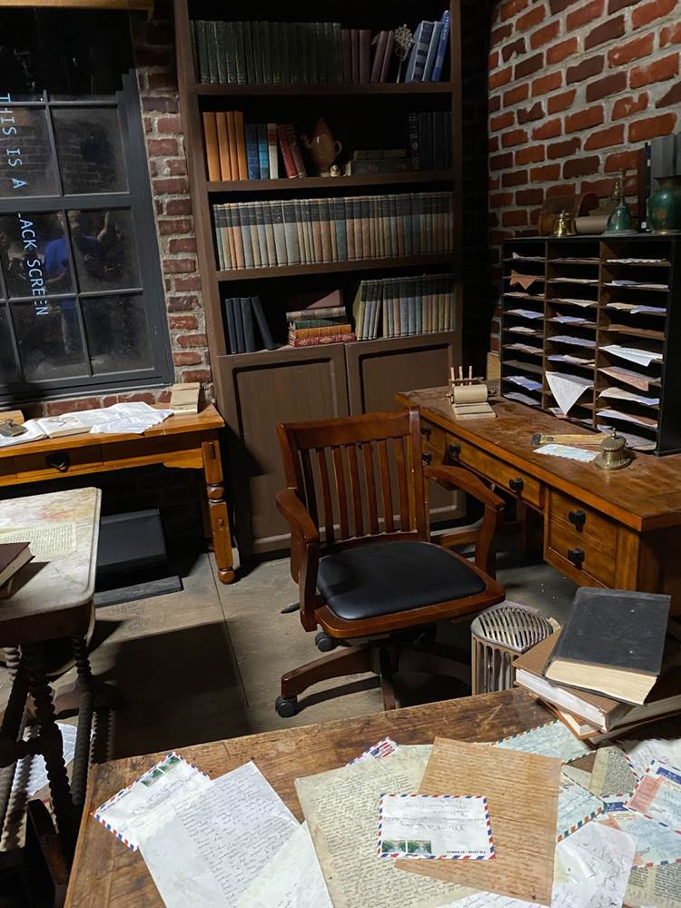 “Then we take you to the paymaster’s office– this is where we introduce the Wolfman. Larry Talbot will be in the chair, mid-transformation. Unlike the other characters that are fully transformed which wear a mask, this is a full-blown prosthetic makeup [effect]. It takes about 90 minutes to get the performers into makeup, which is an eternity for Horror Nights. Hundreds of actors are getting into makeup every single night, but we pick certain characters– La Llorona’s another one– [to have in extensive prosthetic makeup]. All his bones are stretching and popping– it’s the painful, horrible agony of that, and he’s screaming and freaking out, and looking at his hands. A display [in the background] will be projecting the full moon. We wanted to do a fun thing with the moons in this house: every time it’s a scene featuring the Wolfman, it’s a pale blue moon. Every time it’s the Mummy, it’s a harvest moon, which is a golden amber color. And every time it’s Dracula, it’s a blood moon, so it’s like nature itself is reacting to this curse. The research I did for this, I actually pulled illustrations of Charles Dickens’s office in Victorian London, and then our props and dressing crew have to go out and source everything, create all these letters and documents, and then make sure everything’s attached. It’s a tremendous amount of work."