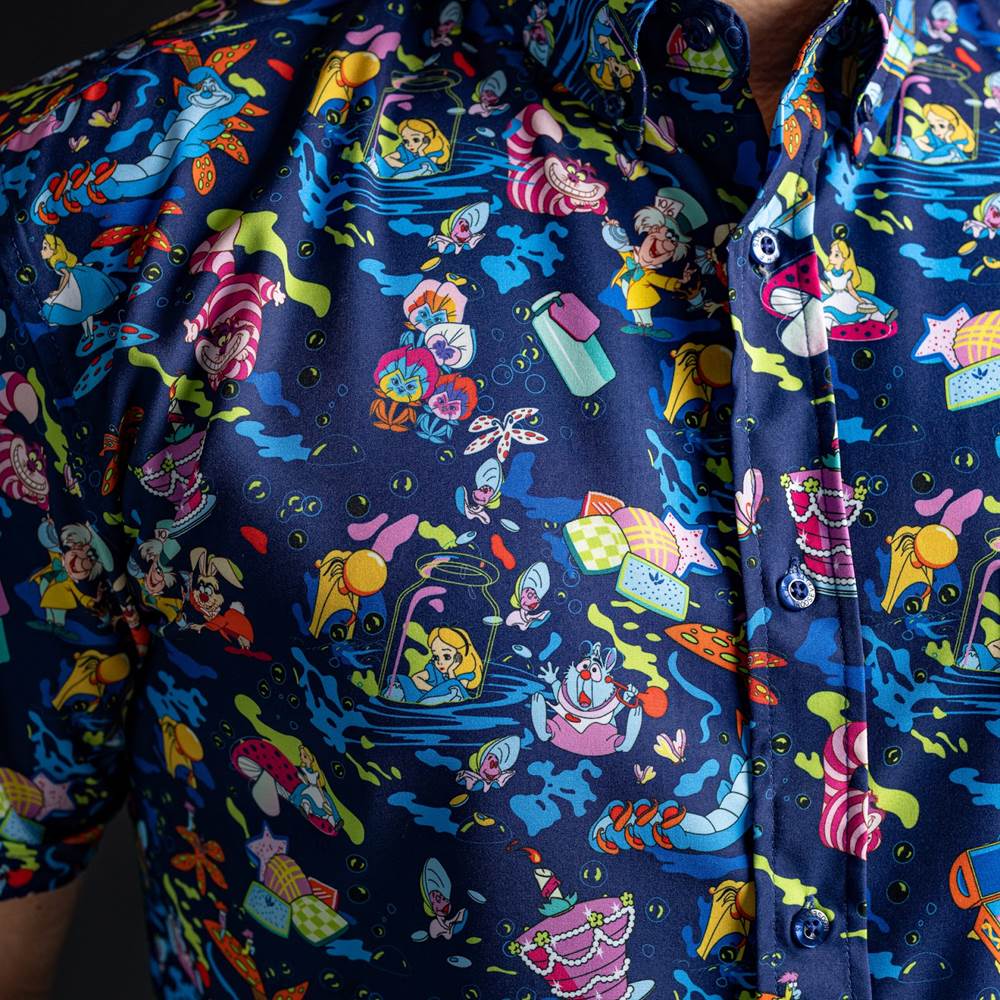 RSVLTS D23 Expo booth exclusives feature three designs that span different franchises but are united in one theme: food and beverage! For the Marvel comic lover there’s a Deadpool inspired chimichanga style; a truly mad and wonderfully colorful Alice in Wonderland top classic Disney fans will enjoy; and a The Mandalorian shirt featuring Grogu with the best snack of all—FROGS!