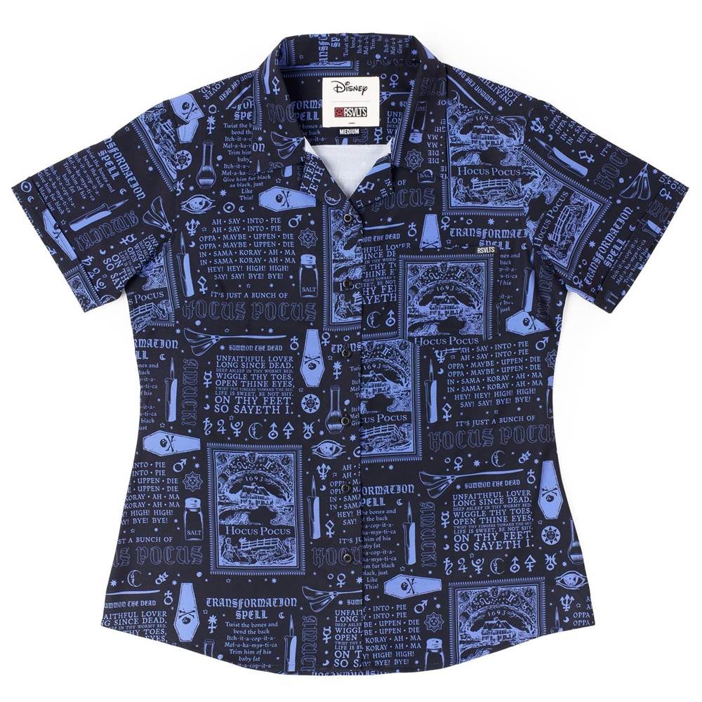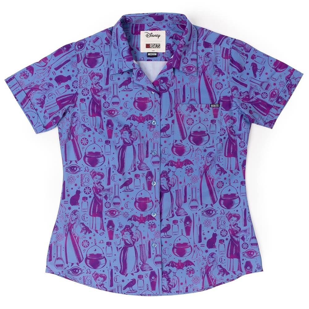 “‘SISTAAAAS!!!’ The Sanderson sisters—the queens of spells, potions, and flying around on broomsticks (and the occasional vacuum cleaner)—are back in action on this illustration style button down! Featuring Winifred, Sarah, Mary, and all the goodies they can fit in a cottage from their Black Flame Candle to their cauldron and their beloved boooook, this shirt is the most devilishly spooky design this side of Salem."