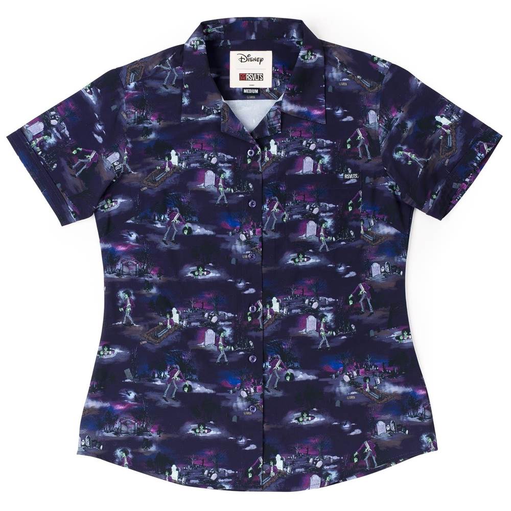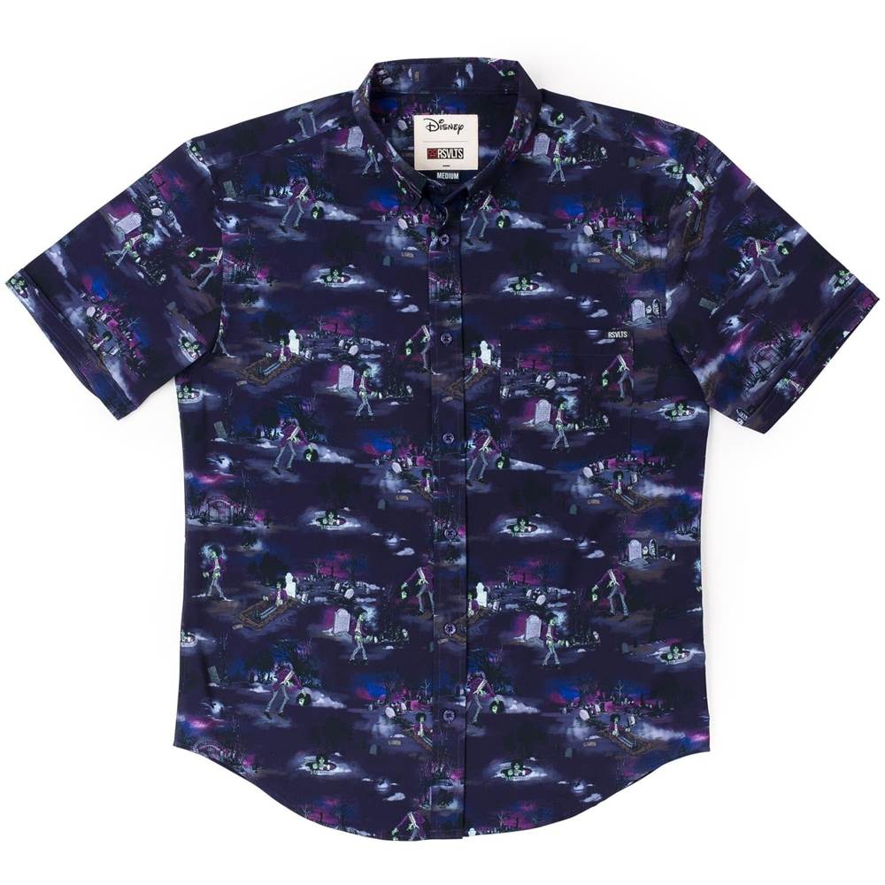 “Poor Billy Butcherson. The guy just wanted to have a long, peaceful slumber, but instead he's awoken by an angry ex who makes him do her dirty work and all he gets for it is a popped-off head and a few missing fingers. He deserved better. Phew, waited centuries to say that. This dark button down, dedicated to everyone's favorite maggoty malfeasance slash good zombie, will make you the hit of the graveyard and beyond."