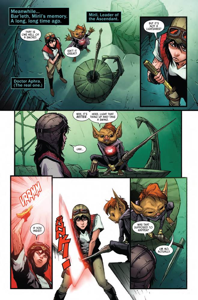Doctor Aphra #25 starts on the Crimson Dawn flagship the Vermillion, where the title character– rogue archaeologist Chelli Lona Aphra– has been possessed by the Spark Eternal and is seeking to accumulate more technology created by the dark-side cult called the Ascendant.