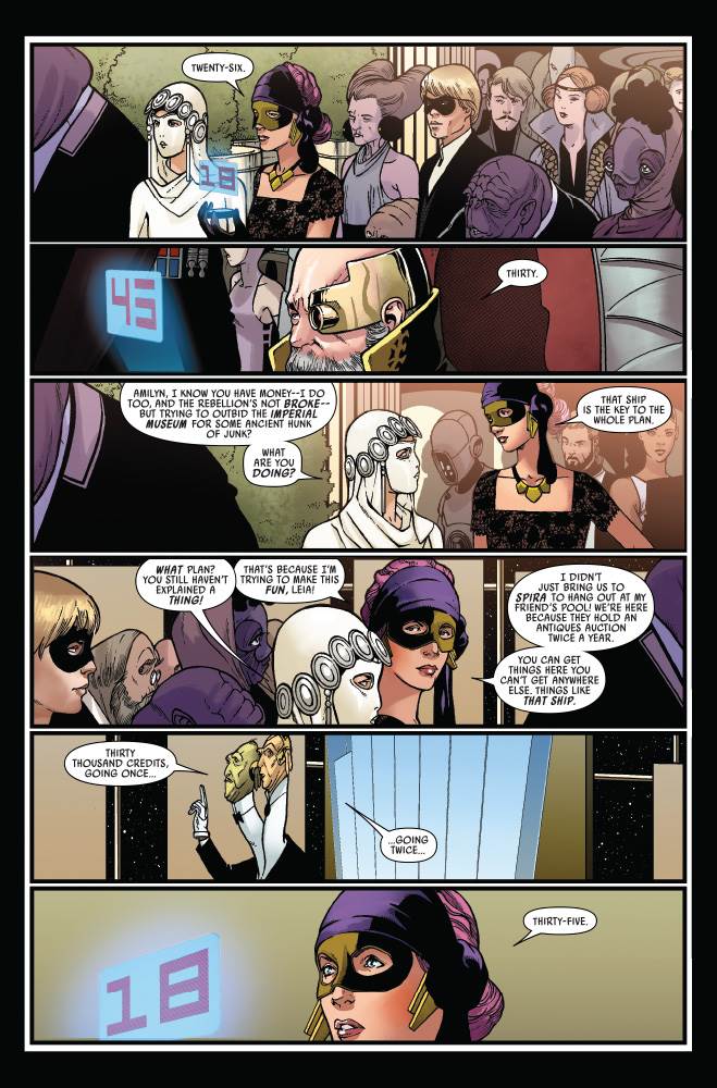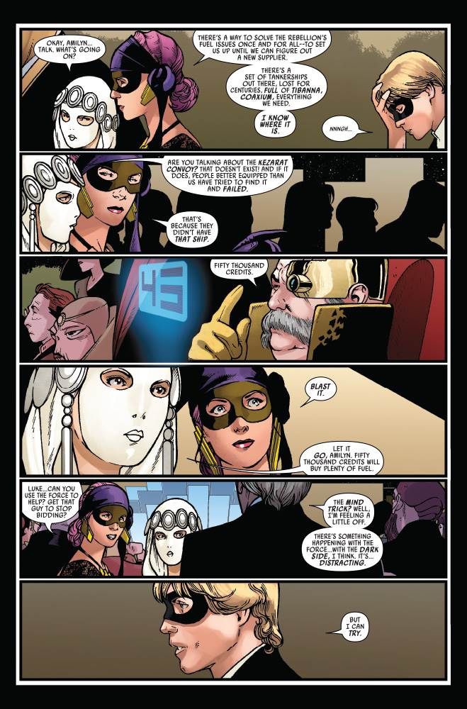 Yes, the gang is ostensibly on the upper-crust Galactic Core planet of Spira for some rest and relaxation between battles, but Holdo does also have an ulterior motive up her sleeve. It seems there’s a Nihil spacecraft from the High Republic era (love that synergy– I mean, interconnectivity… whichever, it’s still fun) up for sale in an auction on the planet. Holdo wants its Path Drive technology to track down a centuries-old lost fuel ship, but the Imperial Museum curator from Coruscant (love seeing that character again) has deep pockets when it comes to the bidding. Luke’s Force powers are on the fritz thanks to a nearby dark-side presence, so our heroes must covertly infiltrate the Nihil ship after the curator wins it in the auction. One showdown against some stormtroopers later, and our protagonists are sitting pretty in space with a genuine Path Engine, though it doesn’t quite seem to work right off the bat. It takes an attack by Imperial TIE fighters and an accidental jump into hyperspace to kick the engine into gear and deliver the crew to a wonderful cliffhanger of an ending that also ties in with a familiar location from The High Republic.