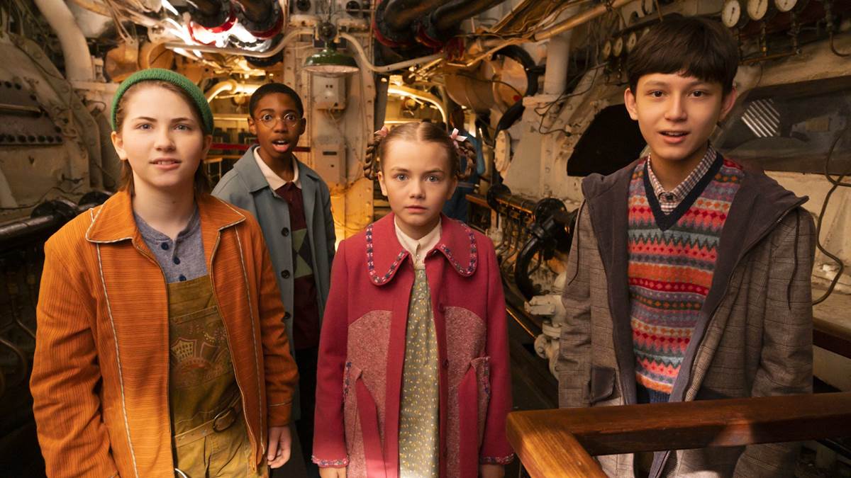 “A Gold Bar in Fort Knox" has the Mysterious Benedict Society in peril, with the water polo team breaking pursuing them into the stateroom. Unable to find the kids, the water polo team leaves, and we see Reynie, Sticky, Kate, Constance, (Mystic Inscho, Seth Carr, Emmy DeOliveira, and Marta Kessler) hanging over the edge of the stateroom balcony. When they climb free, they hide in the engine room wondering how Mr. Curtain (Tony Hale) is behind the current predicament.