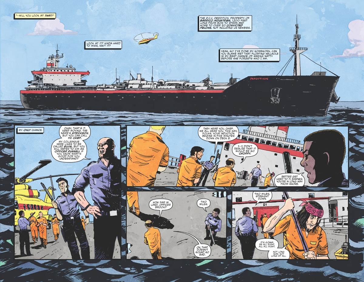 Brokenshire: That, again, was quite organic in terms of the back and forth with Cavan and I, because when he first gave me the breakdown of the idea, the main character was just some sort of street-level American hood. Then when he said that the ship would be out maybe near the Caribbean or in the Atlantic somewhere, I said, ‘Why don’t we make the character Latino, and perhaps of Colombian or Venezuelan extraction?’ Because I am British/Venezuelan, so that way we can incorporate some groovy, snappy language in Spanish as well as English, just to give it flavor. So the main character became this dashing Latino antihero, based on a handsome version of me. [laughs] And much taller, as well. [laughs] No, he’s not based on me at all, but that’s kind of where that came from. Actually, as far as the characters are concerned, that’s probably my biggest influence. I know that [Cavan] had the basic idea of the owners of the ship company being these corrupt people. That stuff was in place already, but [the Latino heritage is] what I brought to the table.