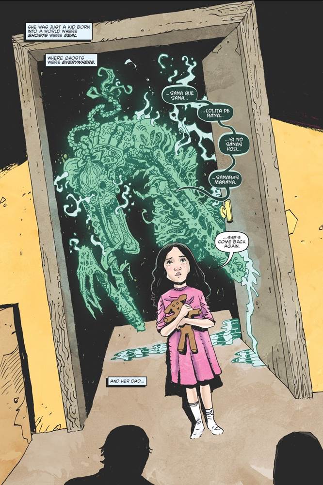 Scott: [laughs] That’s what a disaster movie is all about, isn’t it? It’s one of the things I actually found interesting planning this out from the plotting stage through to making it a six-issue miniseries. I make no bones about the fact that this is a ship going down. This is that story, but at what issue does the ship start to sink? When you’re planning these kinds of stories for film, you spend a lot of time with the characters first. You have to get to know them so they can surprise you, and they can break your heart, and they can make you cheer, and all the things that you do in disaster movies. I suppose our main character is Gus. Gus is a prisoner– he’s a former conman who has obviously been in prison for a while. He’s been given this opportunity to get out a little sooner. [In] the world he lives in, ghosts are very real. People live with them every day. There’s a bit earlier on– which has been shown in the preview art– he’s desperate for his little girl to go to bed, but she can’t because her dead grandma keeps coming back to sing her nursery rhymes and lullabies. That’s the kind of world they’re living in. Gus’s story is wrapped around his daughter– he’s desperate to get back to her, to see her grow up, and as I said he’s been offered this chance to go and do this job on the ship, to scrape ectoplasm off the wall. In this world, ectoplasm is more valuable than oil.