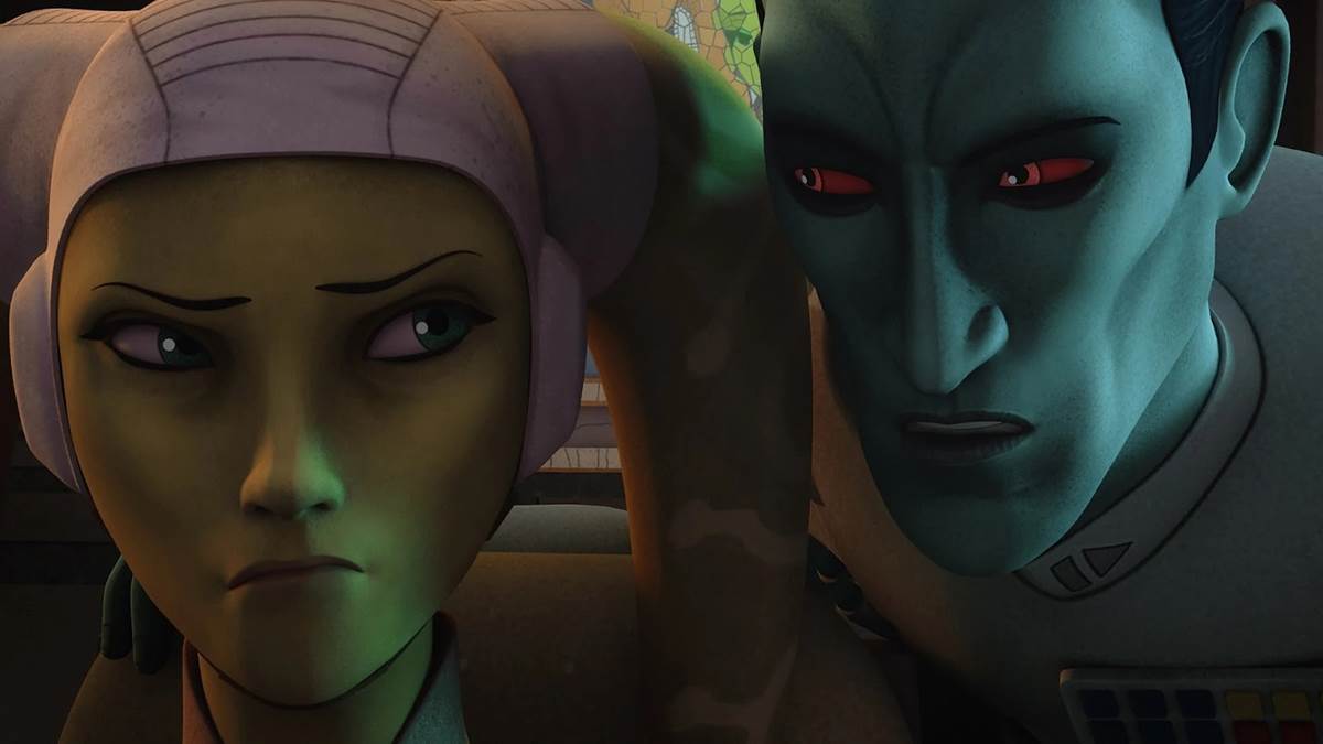 Episode 42: “Hera’s Heroes" – The Ghost visits Hera’s homeworld of Ryloth, only to discover that Grand Admiral Thrawn (Lars Mikkelsen) has begun using the Syndullas’ ancestral home as an Imperial headquarters on the planet. Hera becomes dead set on retrieving an important family heirloom called the Kalikori, but during the quest she and Ezra are captured by Thrawn. Hera’s father Cham Syndulla (Robin Atkin Downes) offers himself to the Empire as a trade for the prisoners, but Hera and Chopper enact a plan that destroys their home but allows them to escape instead of reclaiming the Kalikori, as Thrawn watches on, impressed by the feat.