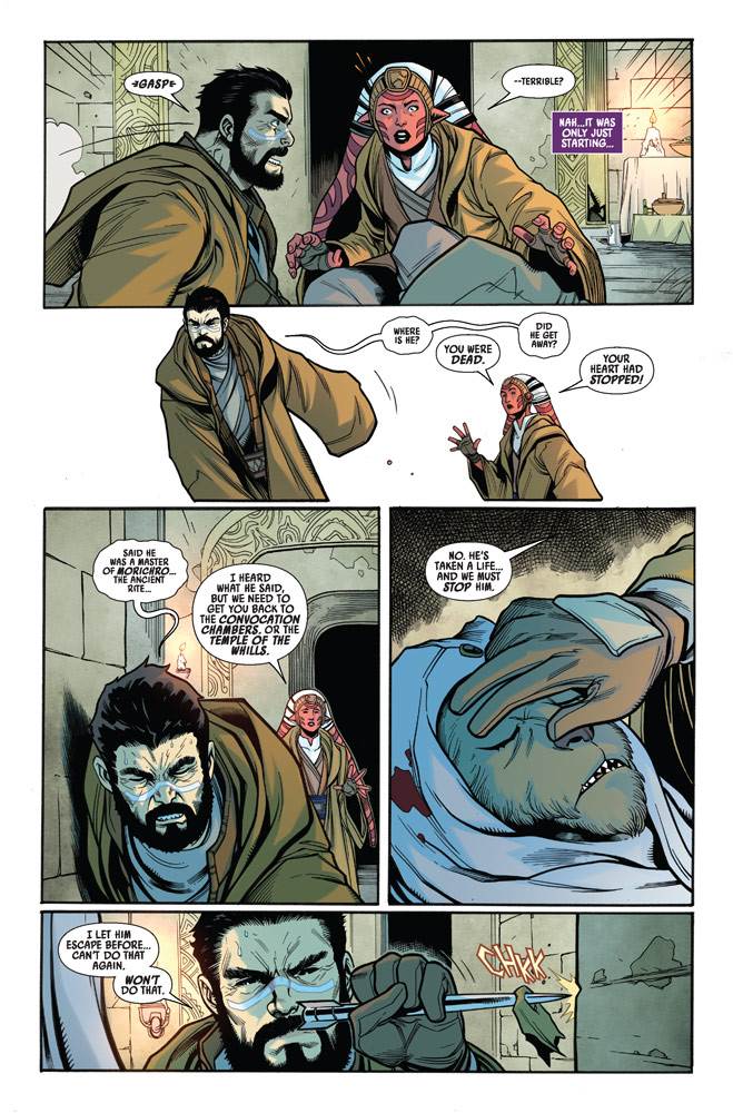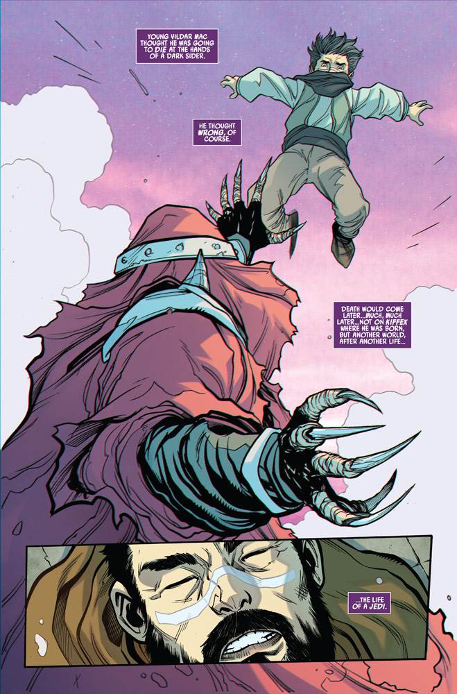 So naturally I found myself just a tiny bit disappointed when, near the beginning of the title’s second issue– released today– it is revealed that Vildar Mac in fact survived the supposed dark-side attack, and lives to fight another day on the Pilgrim Moon of Jedha. It just felt like a fake-out, and a waste of a good jumping-off point, considering the implications of said death.