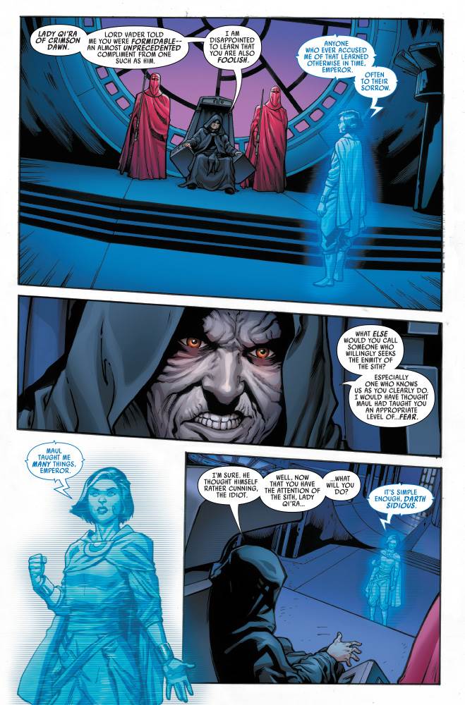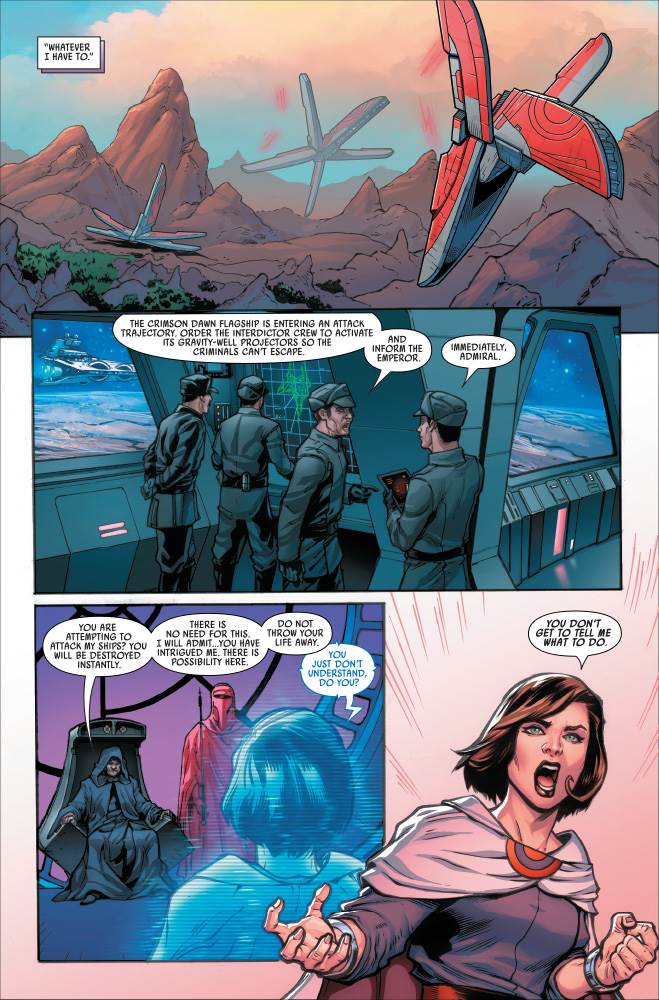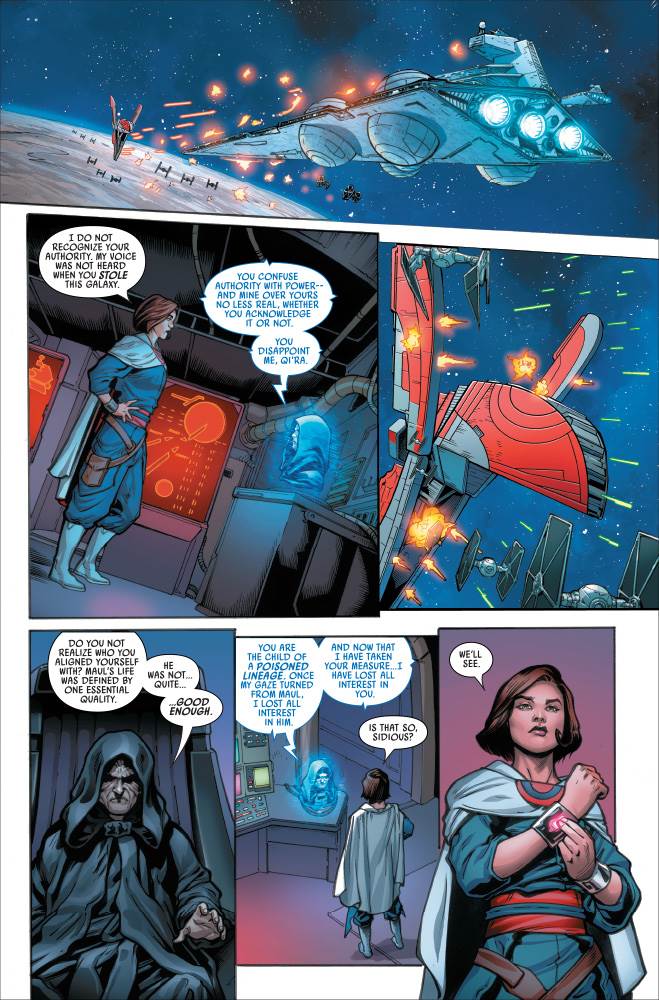 Like with its predecessor Crimson Reign before it, Hidden Empire starts with the mystical being known as the Archivist telling the story of Qi’ra’s eventual downfall, only this time we (kind of) see who she’s telling it to– a couple of hooded figures in silhouette whose faces I’m sure will be revealed at a later date. Anyway, at that point Soule cuts to the “present" and Lady Qi’ra enacting her plan to sow chaos across the galaxy as a distraction while she attempts to bring down the Emperor and his apprentice. Crimson Dawn agents are activated in the Rebellion and the Empire, among other factions, acting out schemes that will likely be depicted in the tie-in issues of Marvel’s ongoing Star Wars comic titles. Then Qi’ra sets in motion the most important part of her strategy, which involves the Archivist and Sith wannabe Kho Phon Farrus (from the pages of Star Wars: Doctor Aphra) triggering an hourglass-like artifact called the Fermata Cage with the reluctant help of the Knights of Ren. We don’t find out what the Fermata Cage is actually supposed to do until near the end of this issue, so I won’t spoil that here except to say it’s fairly intriguing, and when Palpatine realizes what’s happening it actually looks like it worries him, which is no small feat. Regardless, at the same time Qi’ra sends Crimson Dawn’s flagship the Vermillion up against an Imperial Interdictor-class Star Destroyer with explosive results, and the Emperor tells the various other crime syndicates– the Hutts, Pykes, Black Sun, and more– via hologram to stop squabbling among each other (see Star Wars: War of the Bounty Hunters for more on that) and start working against their common enemy.