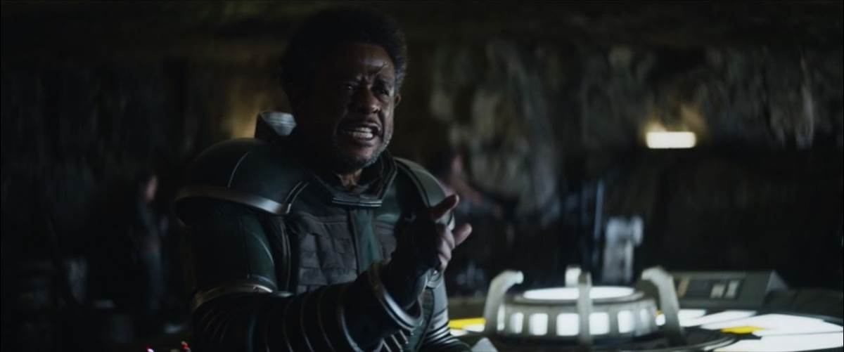 Meanwhile on Ferrix, the droid B2-EMO (voiced by Dave Chapman) is showing some real emotion as Cassian’s adoptive mother Maarva has apparently passed away. At first I thought this was a fake-out to get Maarva out of the city while it’s under the Empire’s watch, but the way characters behave through the rest of the episode leads me to believe it actually happened. Maarva’s death leads everyone to believe that Cassian might return home for the funeral, up to and including Syril Karn (Kyle Soller), who gets a video call from his old brother-in-arms Linus Mosk (Alex Ferns) informing him of the news. Syril takes some credits from his mother’s safe and heads off planet, and then we check in on Senator Mon Mothma (Genevieve O’Reilly), who expresses concern about her daughter Leida (Bronte Carmichael) to her rebel cousin Vel Sartha (Faye Marsay). It seems Leida is hewing a little too closely to outdated Chandrilan tradition for Mon’s liking, and Mothma fears she will have to follow through on crime-boss banker Davo Sculdun’s offer from the previous episode in order to conceal her business dealings with the Rebellion. Next we follow Luthen Rael (Stellan Skarsgard) back to the planet Segra Milo for another clandestine meeting with Saw Gerrera (Forest Whitaker), where Saw surprisingly says he’s changed his mind and is willing to join Anto Kreegyr’s mission.