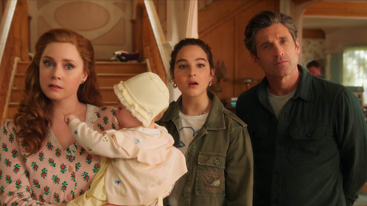 In the real world, Giselle and Robert are moving to suburbia with daughters Morgan and Sophia. When the arrive at their new “fairy tale" home, they meet the new neighbors - three gardening ladies who are clear send-ups of Sleeping Beauty’s Flora, Fauna, and Merriweather. They have a recurring presence throughout the film, even taking care of the baby at one point in time. Though they have little to no dialogue, they are even referenced in the credits as Gardener/Flora, etc, so this clearly was no accident.