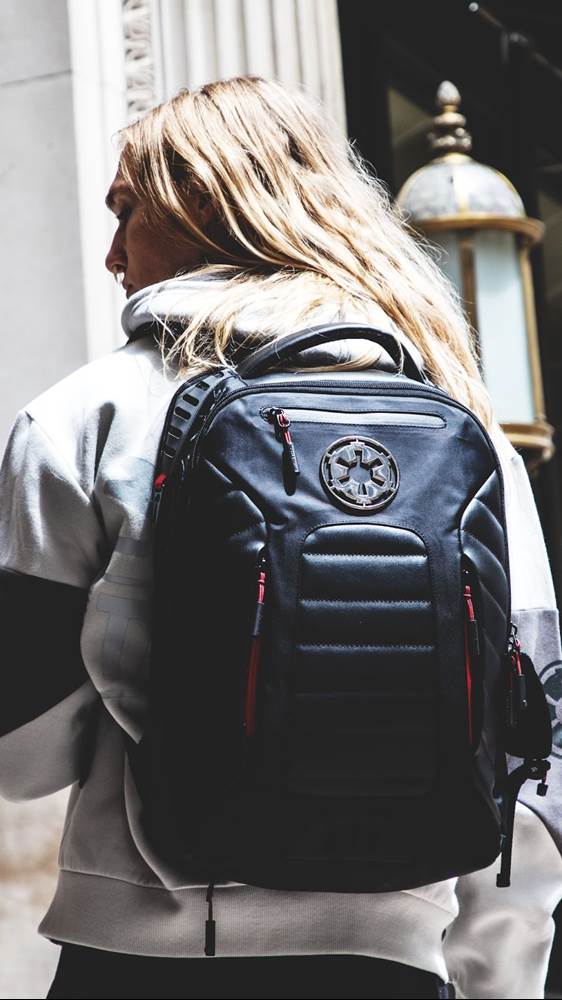 Show your full support for the Empire with a roomy, sleek backpack decorated with an Imperial badge. The bag contains a padded laptop sleeve, bottom zipper compartment with rain cover, side water bottle pockets, and reflective accents.