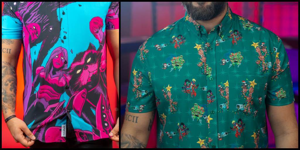 If your holiday wish was for more Marvel shirts from RSVLTS then the gods —but definitely NOT Ego— have heard you and are delivering in a big way! FIVE neon colored patterns featuring Rocket, Groot, Drax, Gamora and Star-Lord are dropping today including one Christmas design.