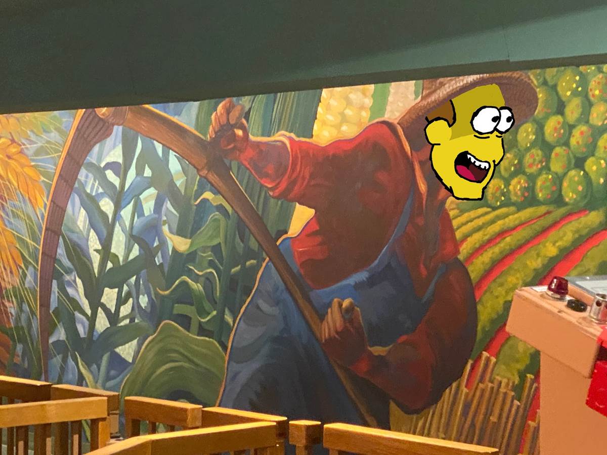 At the farmhouse, we can see the animals outside replaced with ones that have the art style similar to the ones in the series, maybe with an audio-animatronic of Gramma thrown in for good measure to be seen and provide some commentary welcoming to the farm or something. The barn is already filled with screens, so this makes it easy to have animation over the existing footage shown of crops and farmlands as they explain farming. From there, different portions of almost nothingness (and a maintenance bay switch track) can be replaced (or hidden) by a new transition scene— and the first idea I could come up with was a brief, quick encounter with tech tycoon Gwendolyn Zapp.