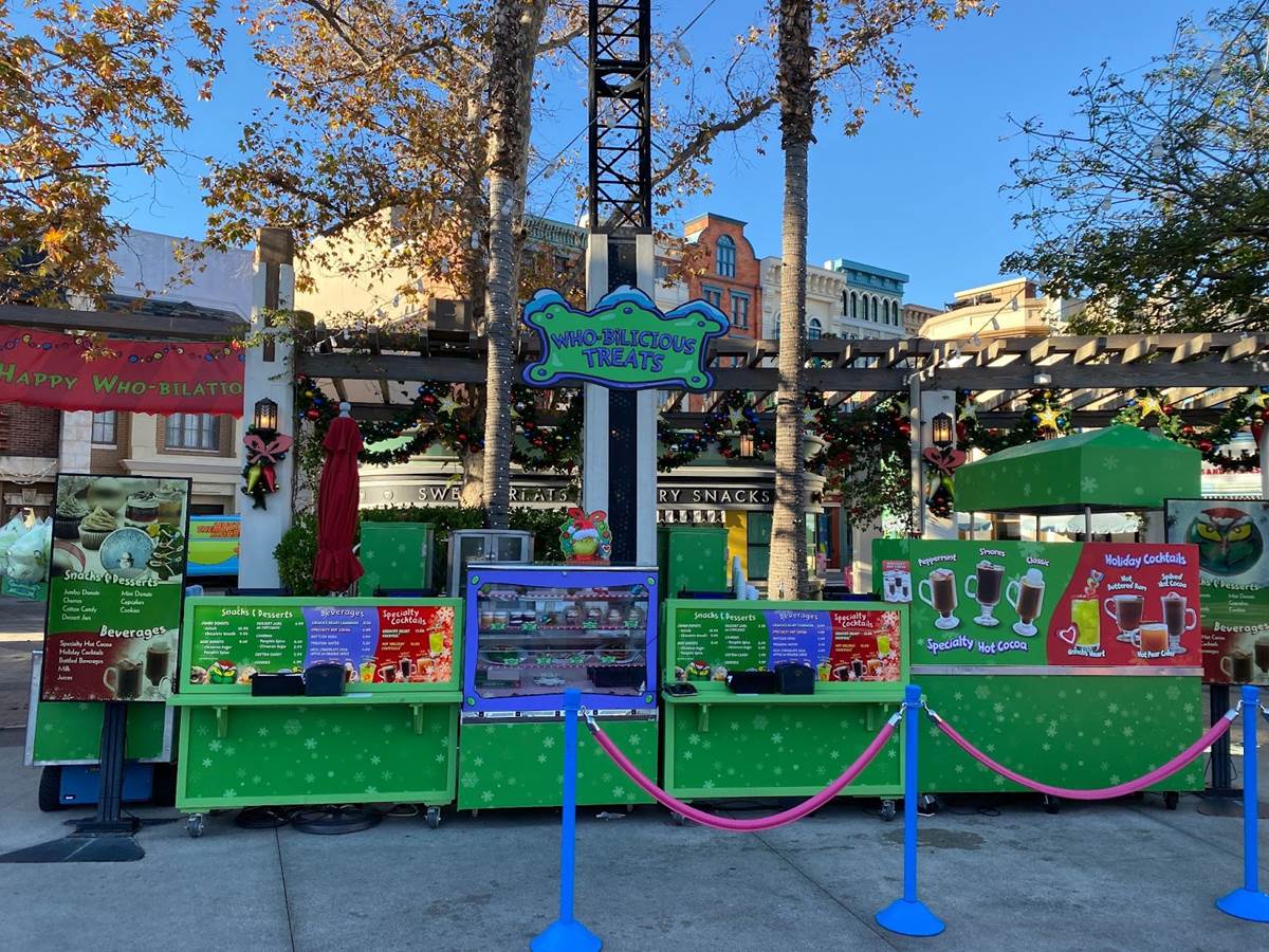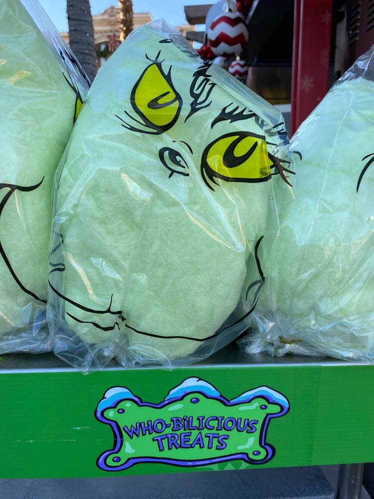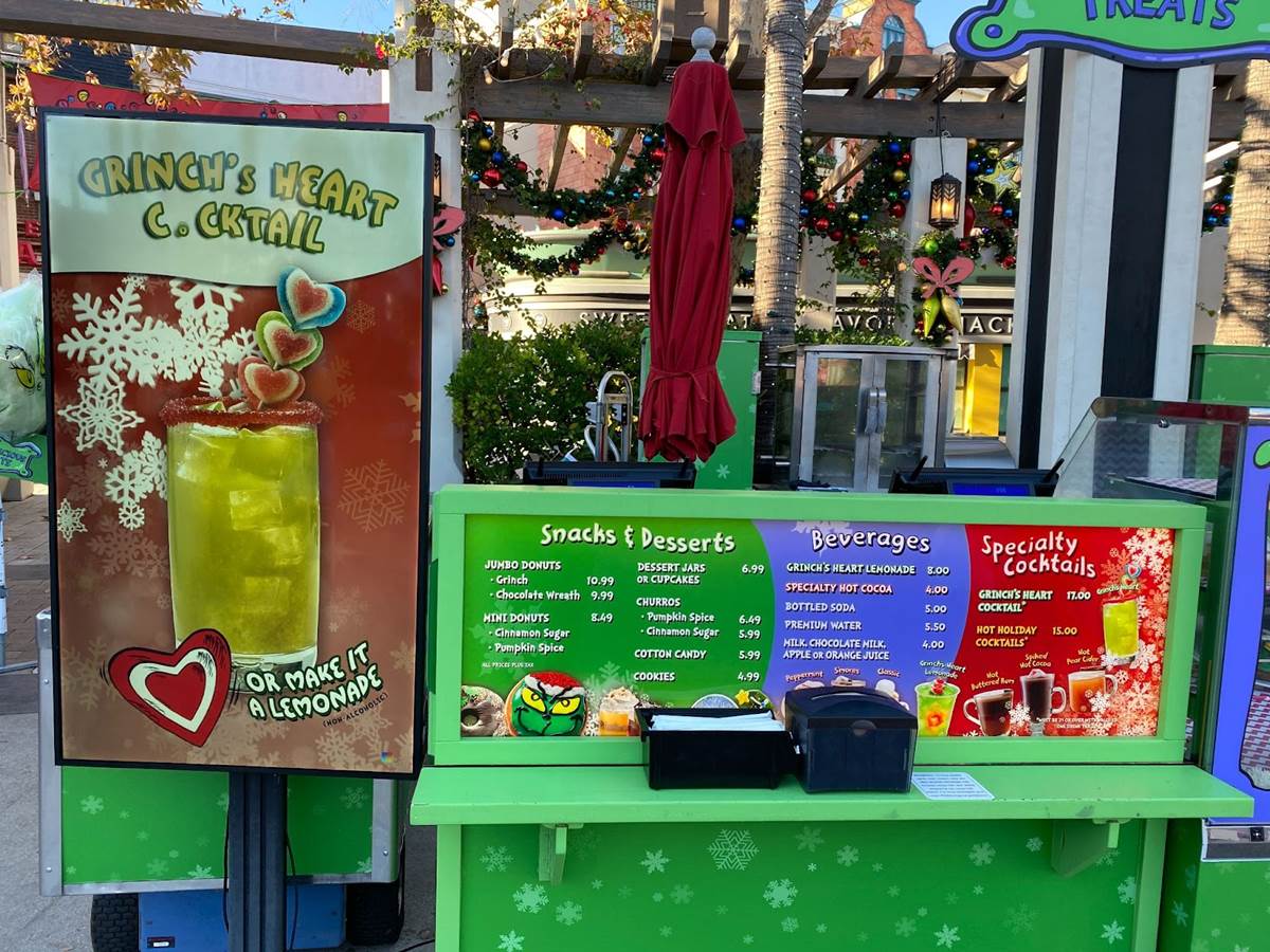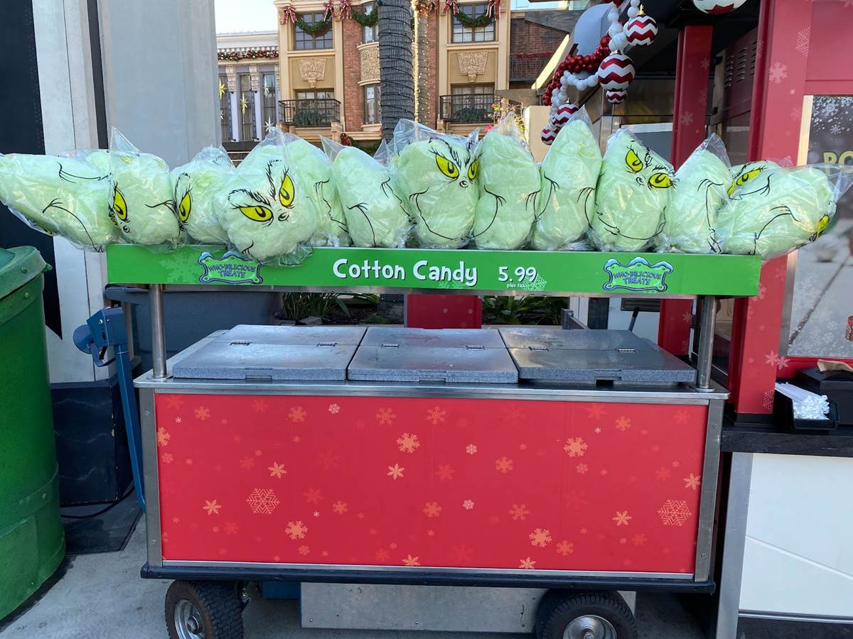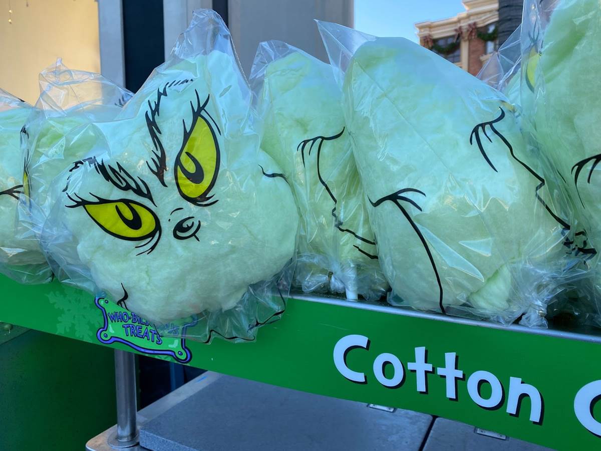 Inside the theme park, Universal Plaza is decked out for the Wholiday with plenty of Grinchmas flair. There’s a Grinch snowman, helpful signage, a Whoville post office where guests can send postcards to the Grinch, and a number of food kiosks and merchandise stands where tasty treats and souvenirs are available. There’s also a Grinch popcorn bucket and Grinch-shaped cotton candy.