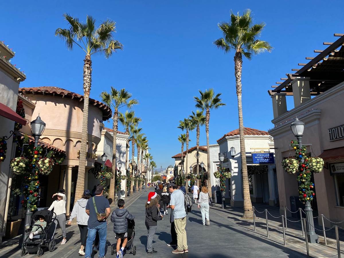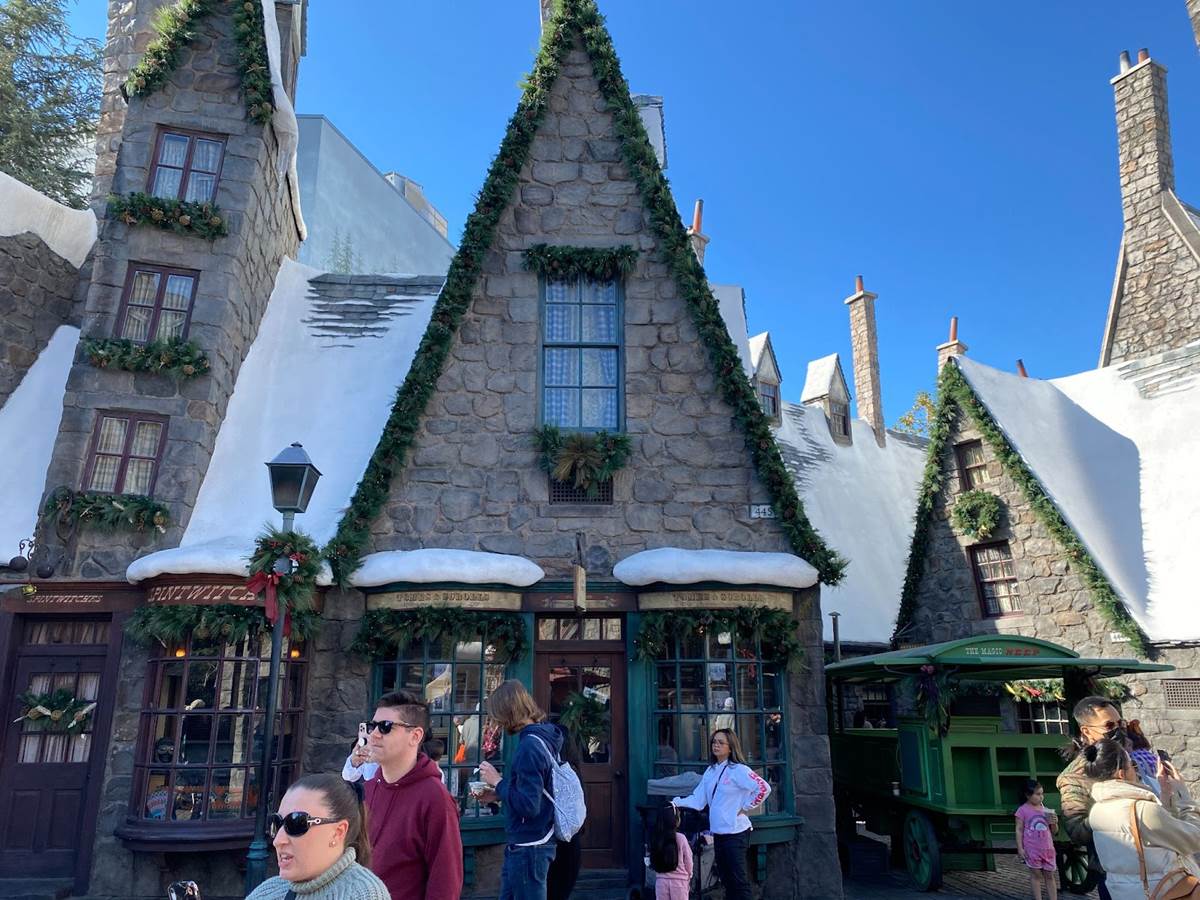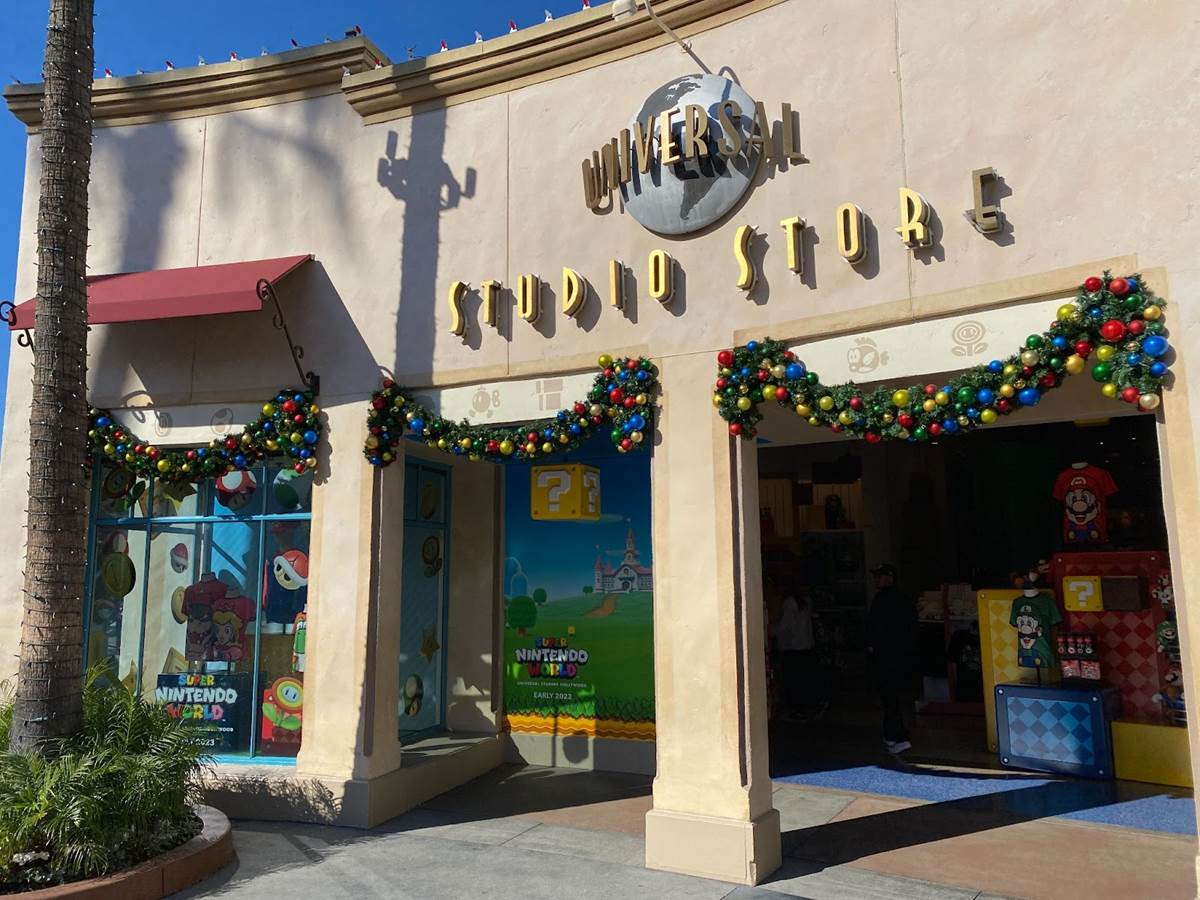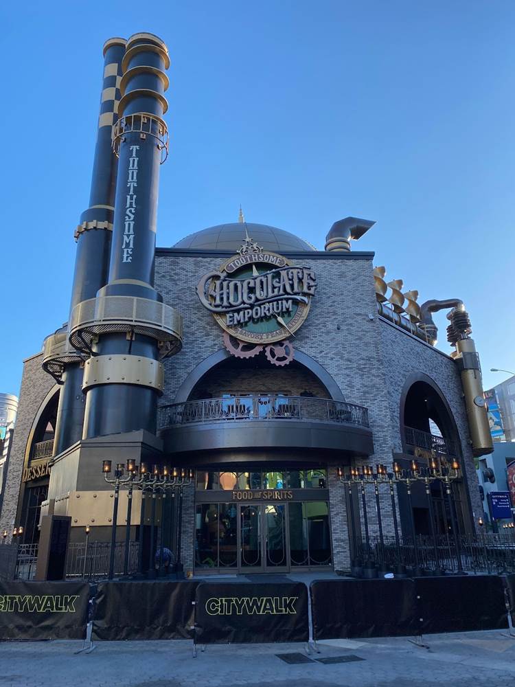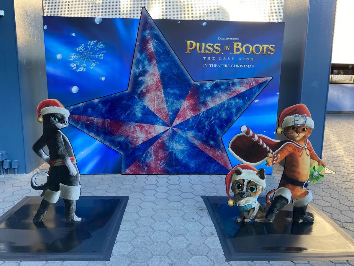 Rewinding time a little bit, when I first arrived at Universal Studios Hollywood, I passed through CityWalk, which is of course decorated for the holidays as well. I also spotted a Puss in Boots: The Last Wish photo op, and noticed that the Toothsome Chocolate Emporium is coming along rather nicely.