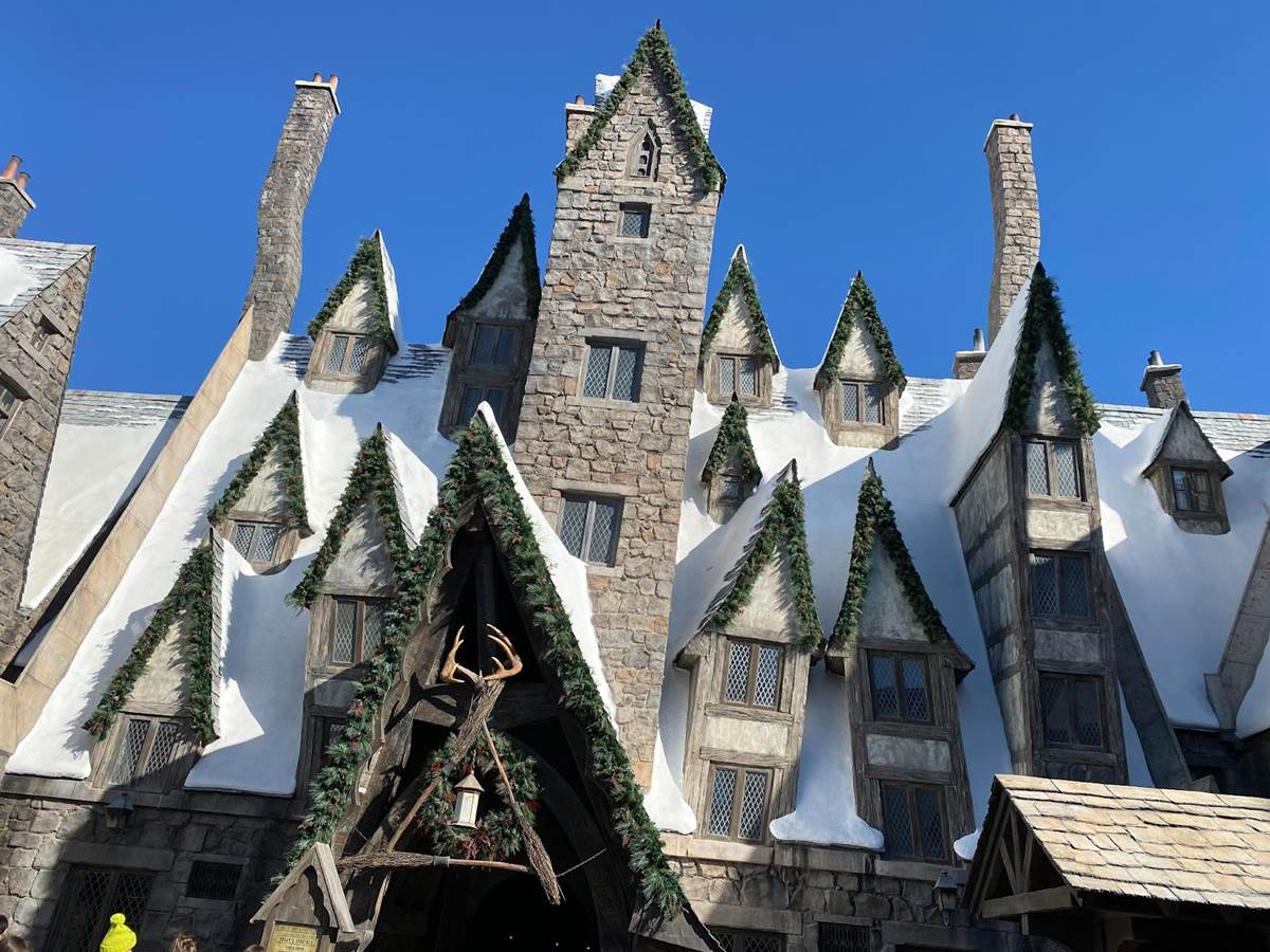 Over in the Wizarding World of Harry Potter, Hogsmeade Village– where guests can savor Hot Butterbeer and watch holiday performances by the Hogwarts Frog Choir– is decorated for Christmas as well. After dark, “The Magic of Christmas at Hogwarts Castle" projection show lights up this familiar location from the Wizarding World.