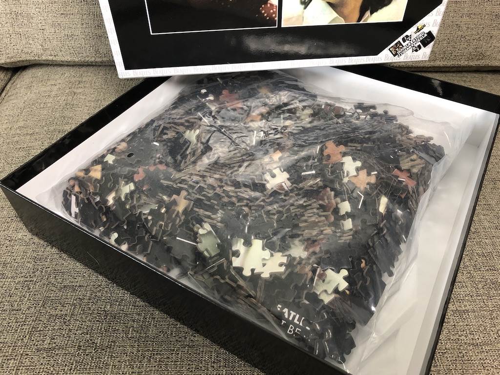 I’ve built dozens of puzzles, some several times over, but I’ve never assembled anything from Factory Entertainment. I was happy to discover that the thickness and quality of the pieces was on par with popular brands like Ravensburger, Buffalo and Aquarius. One side presents the band’s 1970 album cover (their last studio project) with portraits of John, Paul, Ringo and George; and the other shows more pictures and the Side A and Side B tracklist. The puzzle is square in shape, measuring 25 inches x 25 inches and recommended for fans 14 and up.