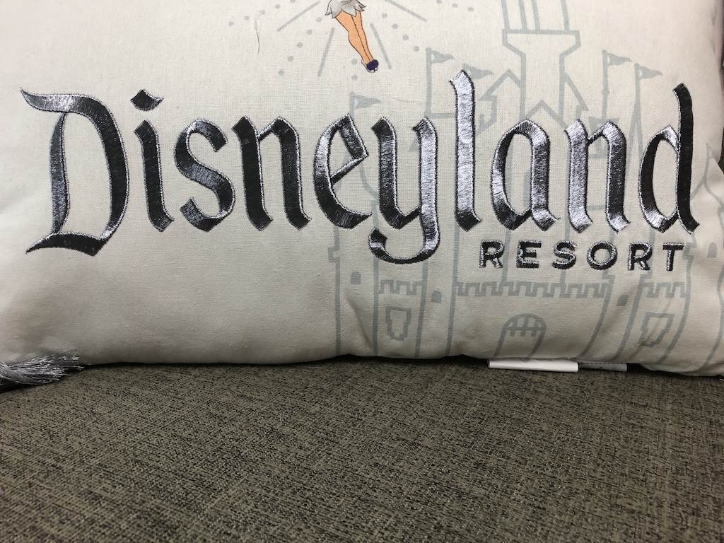 While there are charming Ear Headbands, designer bags, ornaments, plush and figurines, one of the stand out pieces for me was the Disneyland Throw PIllow. It features Sleeping Beauty Castle on one side and a Mickey Head on the other while platinum tassels decorate each corner. We ordered it on day one and just received our pillow yesterday. It looks amazing on our couch. But was it worth it?