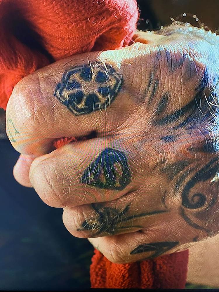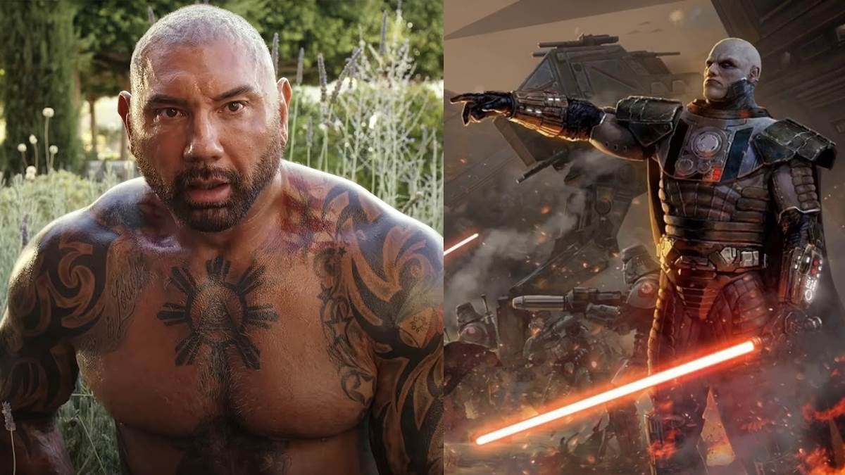 In Glass Onion, the character of Duke Cody (played by actor and retired professional wrestler Dave Bautista from Marvel Studios’ Guardians of the Galaxy movies) is established as a former geek who became a men’s rights activist on social media, who also happens to be covered in tattoos. At one point in the film, Johnson gives us a close-up of Duke’s fist and a look at the tats on his fingers, one of which is the Superman logo. But above that, big as day on the forefinger, is the insignia for the Sith Empire, which was established in the Star Wars: Knights of the Old Republic video game series and its MMORPG spinoff Star Wars: The Old Republic.