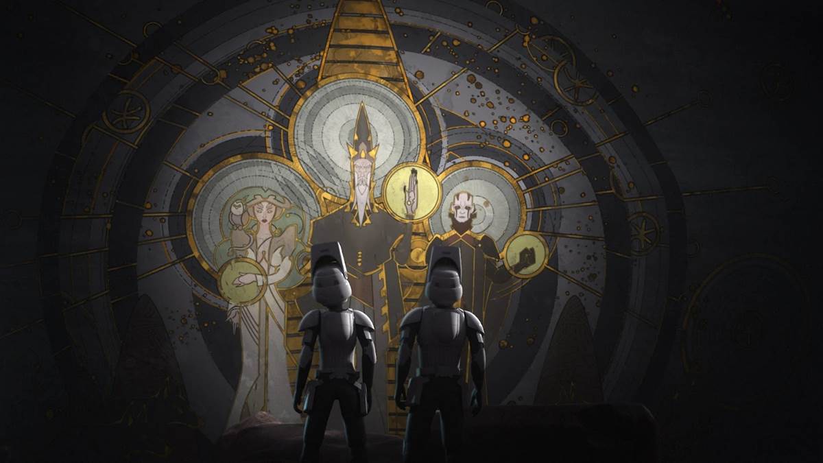 Episode 71: “Wolves and a Door" – Based on a clue provided by the Loth-wolves, Ezra and his friends travel to the location of Lothal’s ancient Jedi temple, the site of which they now find being excavated by the Empire. Ezra and Sabine work together to decode the message on a large door painted with cryptic images of the Father, Son, and Daughter from The Clone Wars’ fabled Mortis arc. Once they successfully solve the riddle, the painting comes to life and the depictions of the wolves create a traversable portal in the rock wall. Just as they are about to be captured by stormtroopers and an Imperial minister, Ezra escapes into the portal, though Sabine is taken into custody.