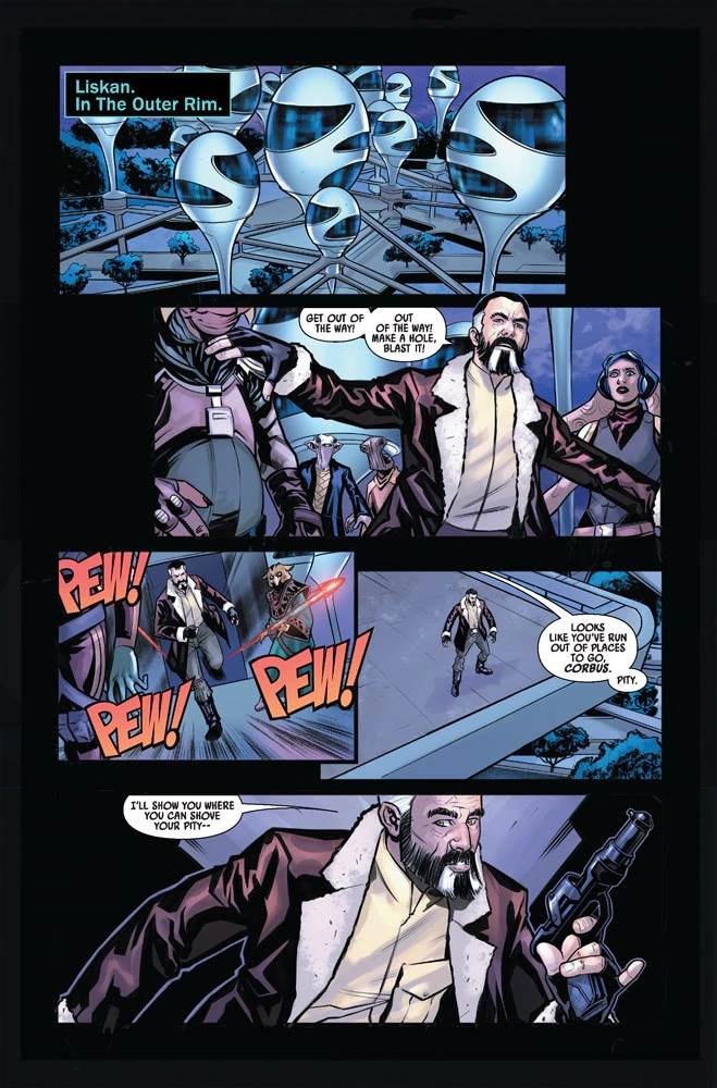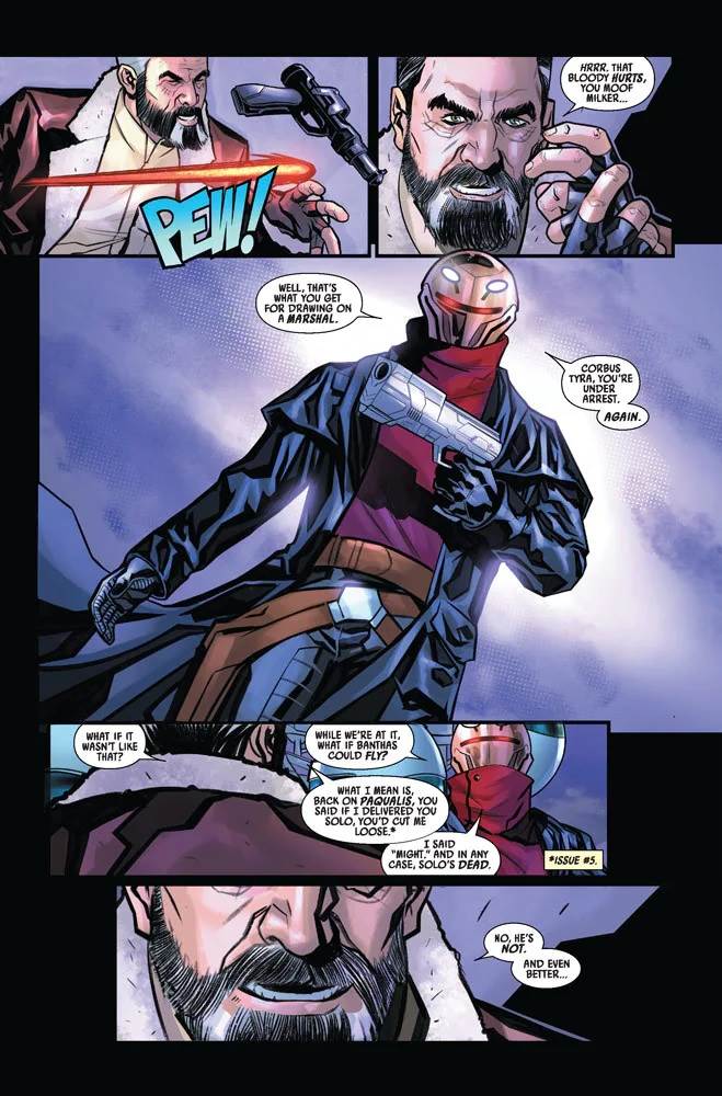 Regardless, Han and Chewie come up through the sewers using the schematics provided to them by Phaedra and manage to take out an entire squadron of Death Troopers via sneak attack. Then when alarms start to blare, Han finds the urn in Tarkin’s private stash and the crew escapes through the windows by jumping onto a moving train– Phaedra says they’re lucky the train was on time, but again I’m having trouble wrapping my brain around how this was part of her plan from the beginning. Meanwhile, we check in on Corbus Tyra, the scoundrel who previously claimed to be Han’s long-lost father, who is fleeing from Marshal Buck Vanto on the Outer Rim planet Liskan. Corbus is cornered, but he gets on Buck’s good side by promising him Solo. Back on Coruscant, we get a cliffhanger ending of Chewbacca seemingly falling to his demise from the speeding train (I think we know how that turns out), and for the first time I’m left feeling thankful that this is a miniseries and not an ongoing comic. Part of me wants to believe that there are plenty more interesting things to do with these iconic characters during the primes of their lives, but if all the powers that be can come up with are endless heist stories, I suppose I’m glad that those Solo: A Star Wars Story movie sequels never materialized.