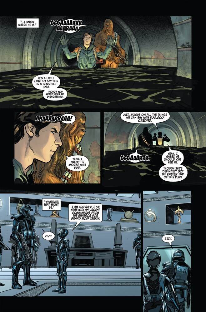 What makes it feel even more repetitive is that Han and Chewie are even after the same item they were the first time around– an urn containing the remains of one of Jabba the Hutt’s rivals. But this time it’s being kept under watch in Grand Moff Tarkin’s office on the Imperial capital planet of Coruscant. Anyway, Han Solo & Chewbacca #6 begins on Tatooine, where the title antiheroes have tracked Greedo back to Mos Eisley in order to reclaim the Millennium Falcon from the Rodian bounty hunter. They also get the information they need about the urn’s whereabouts and together with Chewie’s new friend Phaedra, who he met in prison, they travel to Coruscant aboard their ship. Luckily for Han and Chewie, Phaedra seems to have all the plans and connections when it comes to the capital, and she concocts a scheme to enter Tarkin’s office through the sewer system. Phaedra disguises herself as an RA-7 protocol droid (AKA the Death Star Droid if you know Kenner’s original Star Wars action figure line) and successfully lures Tarkin out of his office with a lie about Emperor Palpatine needing his help to thwart a potential assassination attempt. This is where things start to really stretch the realm of believability for me, but at this point it almost feels like writer Marc Guggenheim is more interested in getting things over with than having them make sense in-universe.