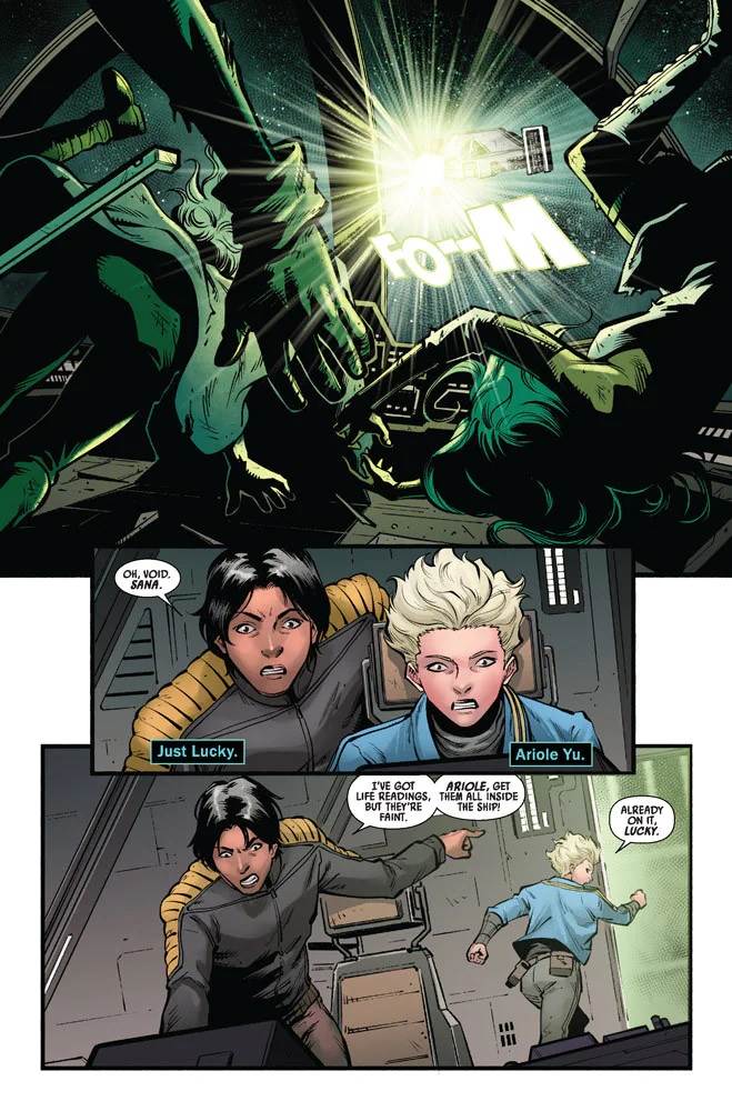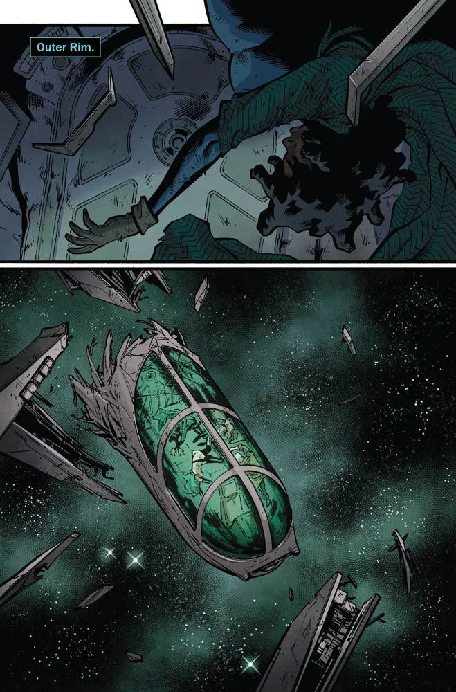But Doctor Aphra #27 begins with writer Alyssa Wong checking in on the crew of Sana Starros’s ship the Volt Cobra, which was destroyed by the Spark Eternal in the cliffhanger ending of the previous issue. Sana and company survive, of course, and they are rescued by the assassin Just Lucky and his compatriot Aroile Yu. They’re taken back to Canto Bight, where the recently revived Ronen Tagge demands that in exchange for saving their lives via his high-tech bacta tanks, they bring him the Spark. Starros ultimately turns down his offer, and instead proposes that they assassinate his aunt Domina Tagge in the service of Crimson Dawn. Meanwhile on the Ark Angel IV, the Spark is experiencing some discomfort due to a virus it contracted from interfacing with Aphra’s “evil murder droids" Triple-Zero and BT-1. Inside Aphra’s brain, Chelli negotiates with the Spark for a release from her mental prison. Then on an unnamed planet that we’ve also seen in Marvel’s Star Wars: Hidden Empire miniseries, Kho Phon Farrus begins to get fed up with working on the Fermata Cage with the Archivist, and steps away to send a message to archaeology student Detta Yao.