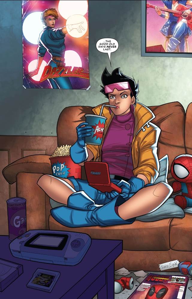 The nostalgia has won me over. “X-Men ‘92: House of XCII #1" as a series really brings back X-Men: The Animated Series in comic form and this one page pretty much perfectly captures all of that. The art style mirrors the series while the details - Dazzler poster, Spidey plush, Deadpool magazine cover, and various other ‘90s vibes - really bring it home. And then there’s the almost meta line from Jubilee that pulls it all together.